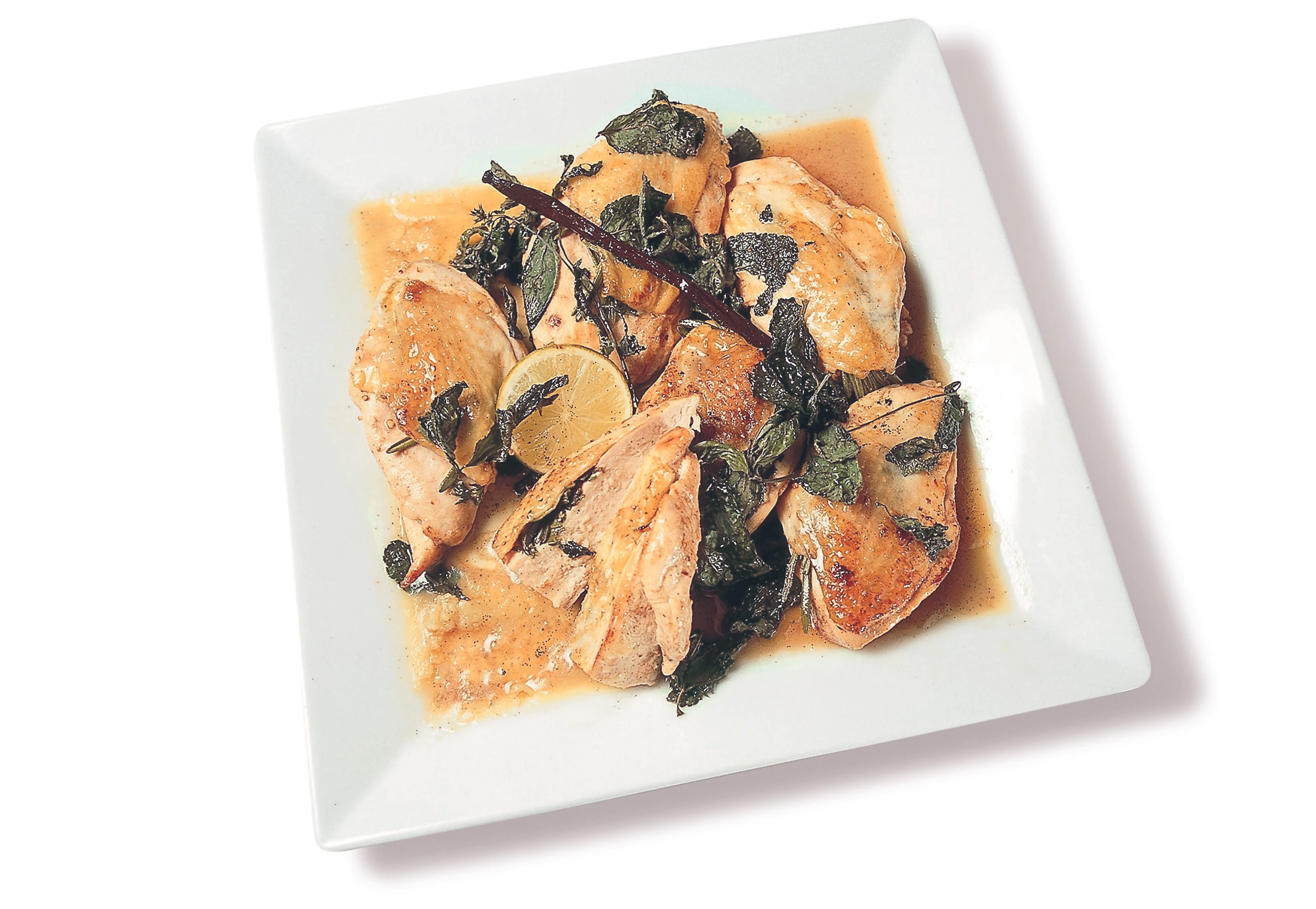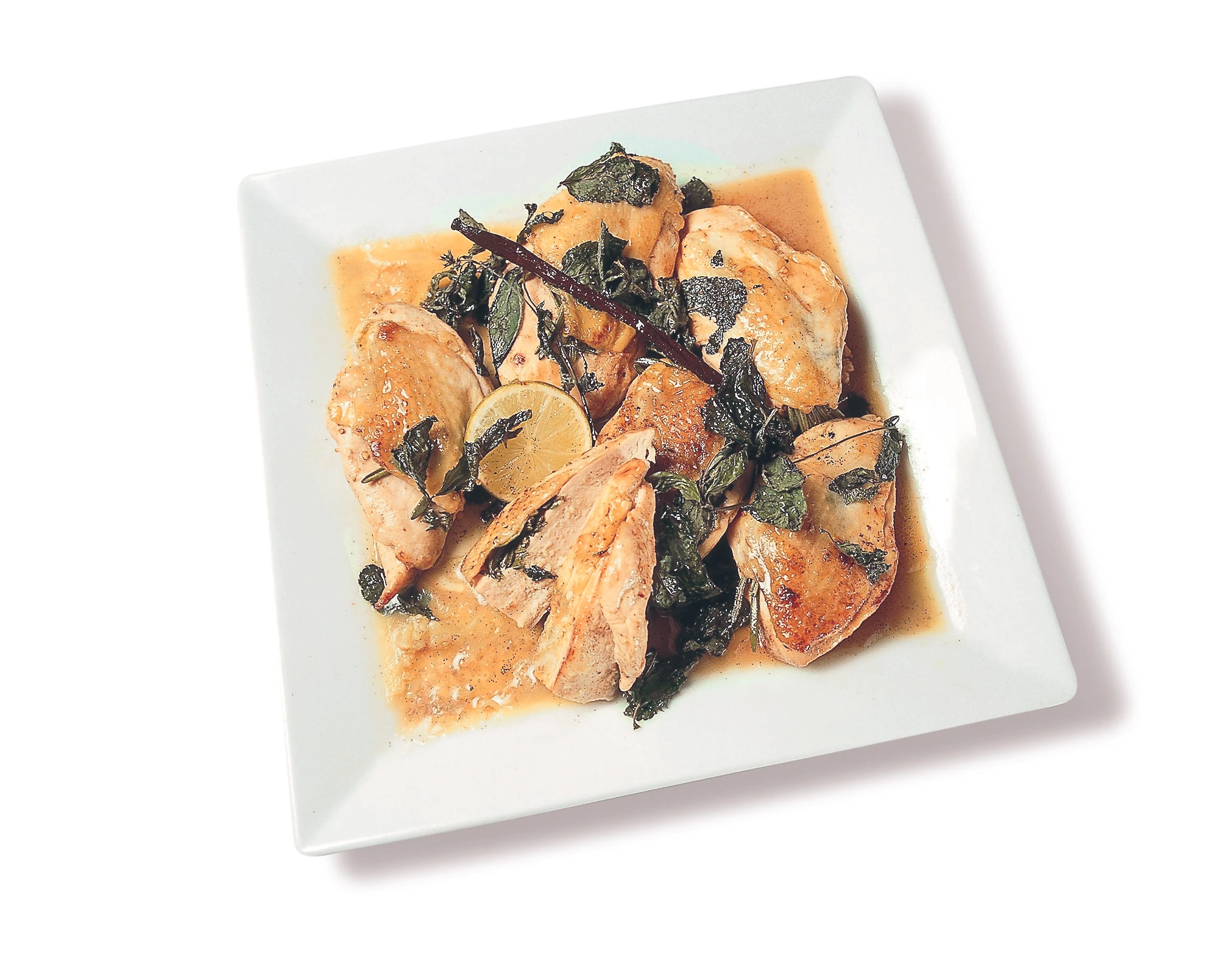 Hühnerfilets in heißem Öl beidseitig gut anbraten (Hautseite zuerst), mit Minze bestreuen und mit der Hautseite oben ca. 8 Minuten im Rohr (mittlere Schiene / Gitterrost) braten.