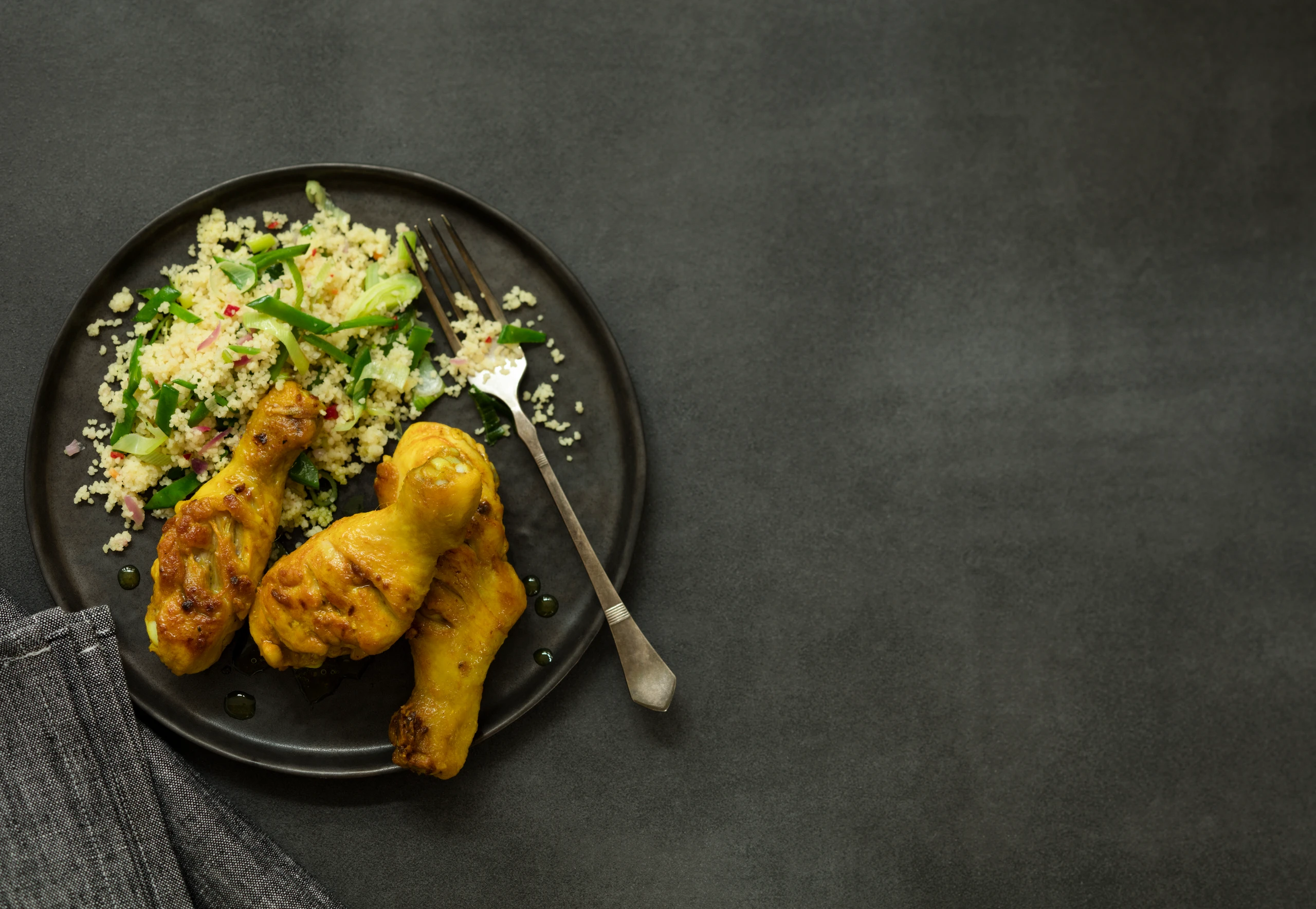 Keulen rundum in kurzen Abständen einschneiden, mit Salz, Pfeffer, Knoblauch und Kurkuma würzen und in 3 EL Öl scharf braten. Hitze reduzieren, Keulen unter öfterem Wenden zugedeckt ca. 12 Minuten garen. Couscous mit den Keulen anrichten.