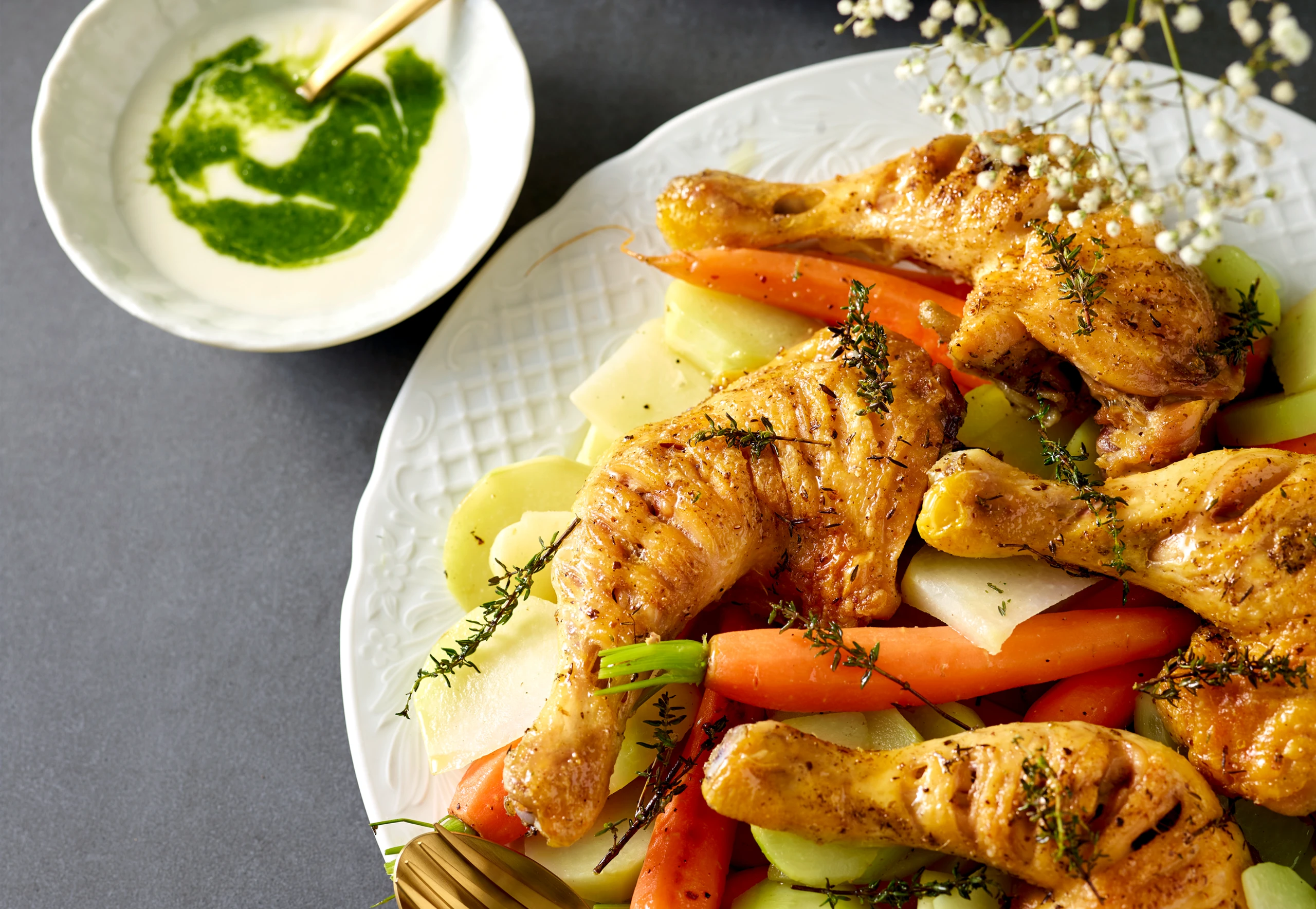 Hendlkeulen mit Petersilsauce und Frühlingsgemüse