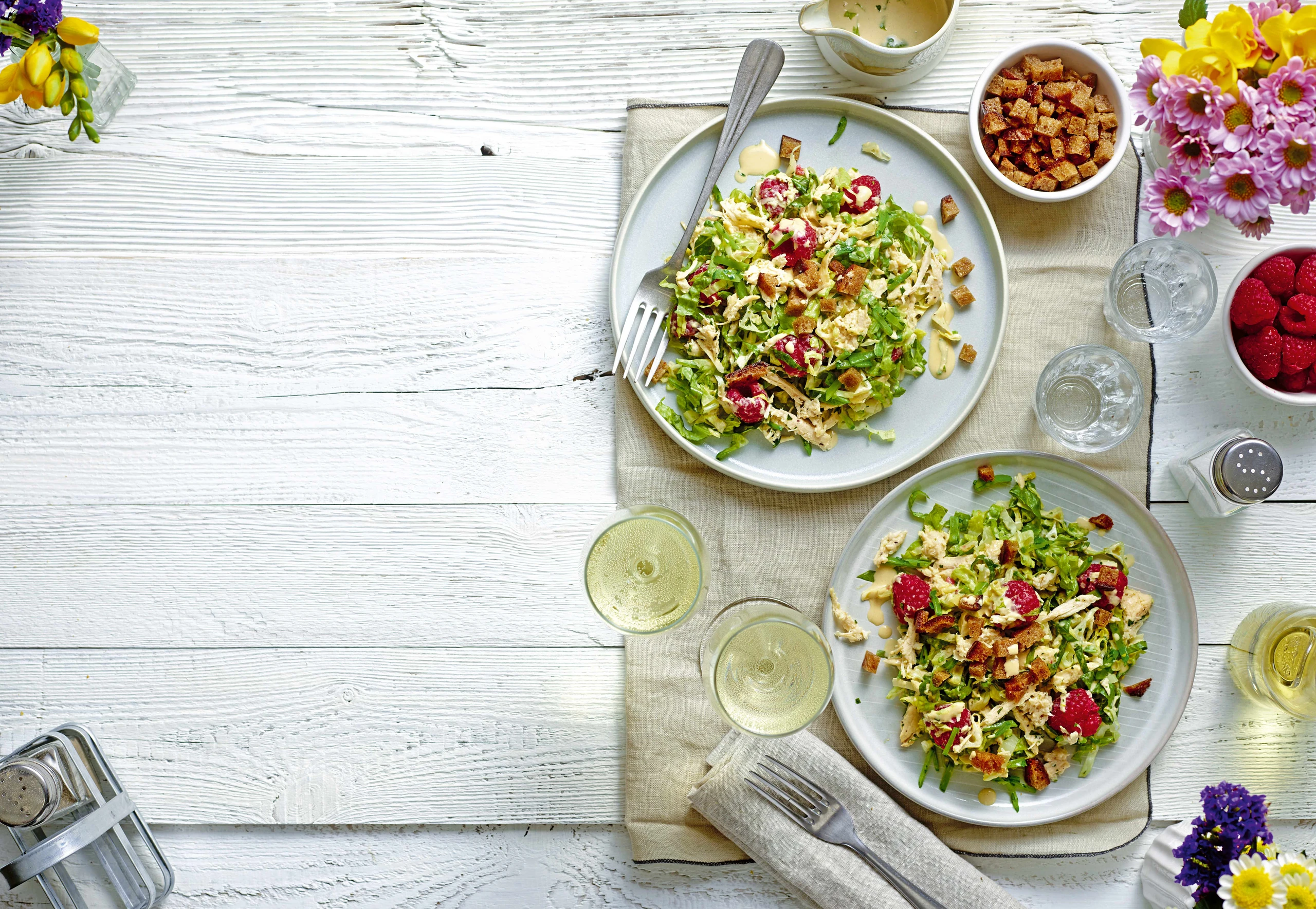 Hühnerfleisch, Salat, Schoten, Petersilie und Himbeeren mit zwei Dritteln des Dressings behutsam vermischen. Anrichten, mit übrigem Dressing beträufeln und mit Brotwürfeln bestreut servieren.