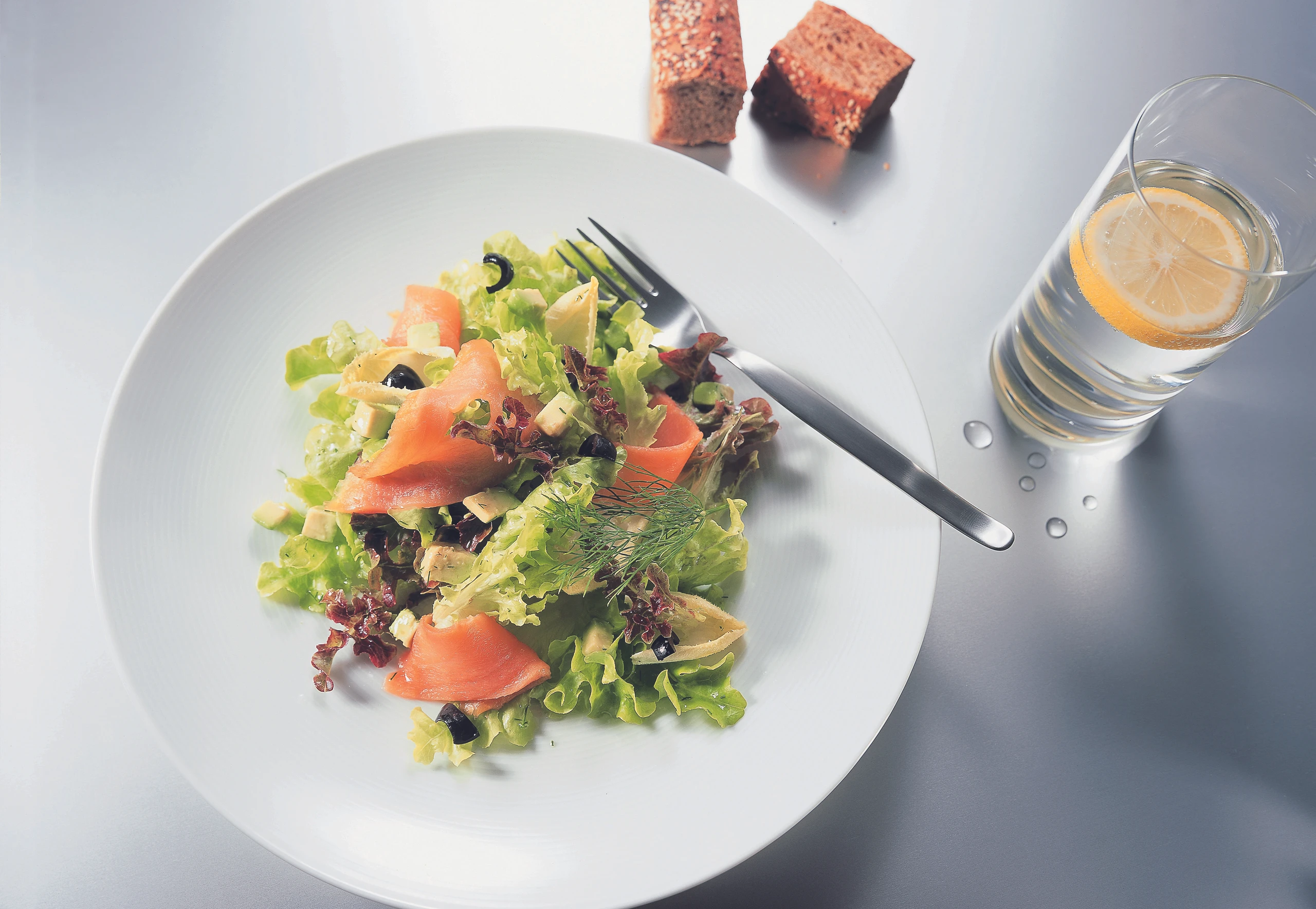 Salat, Avocado und Oliven mit der Marinade behutsam vermischen und anrichten. Salat mit Lachsstreifen und Dillzweigen garnieren. Dazu passt Baguette.