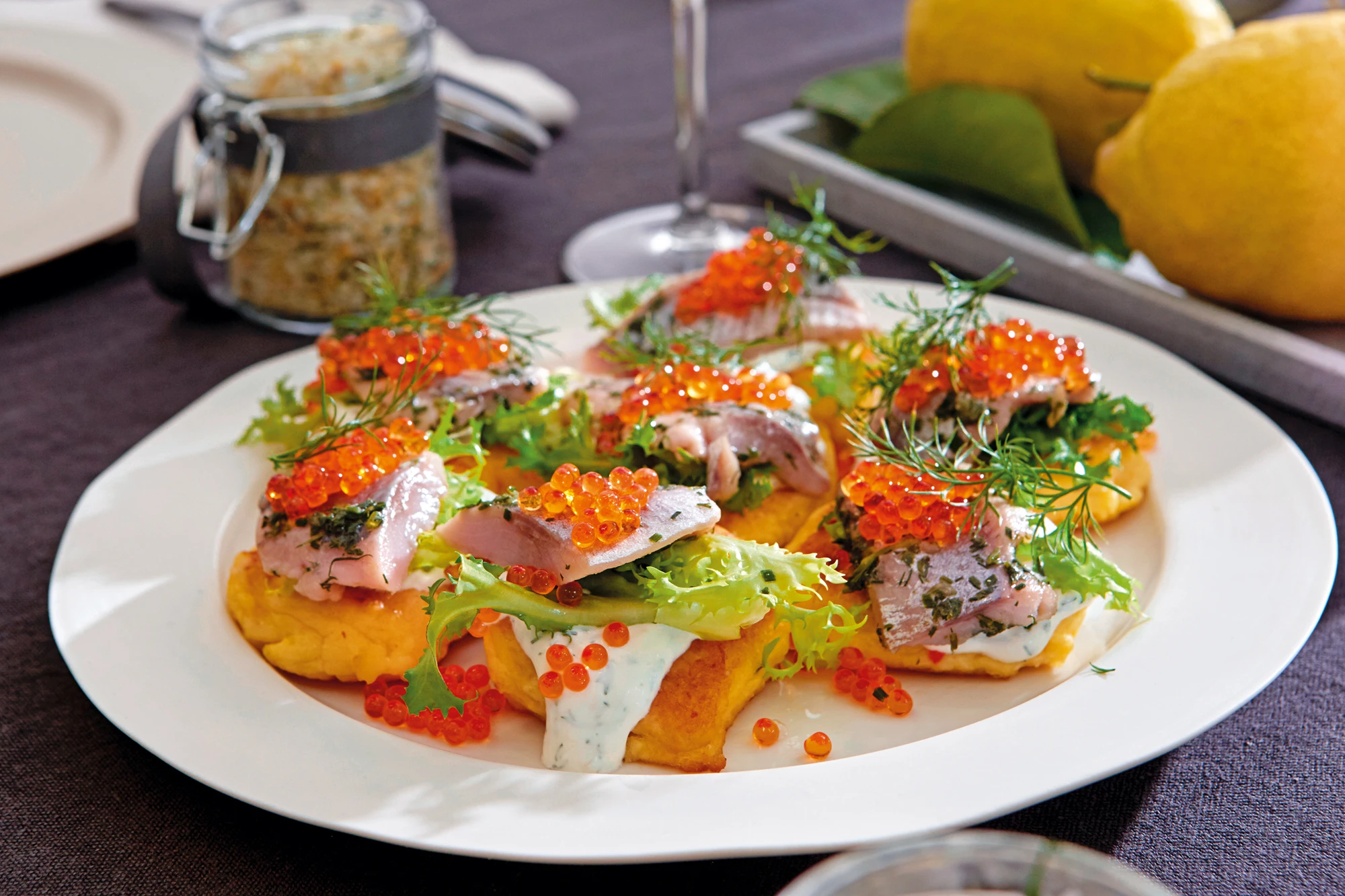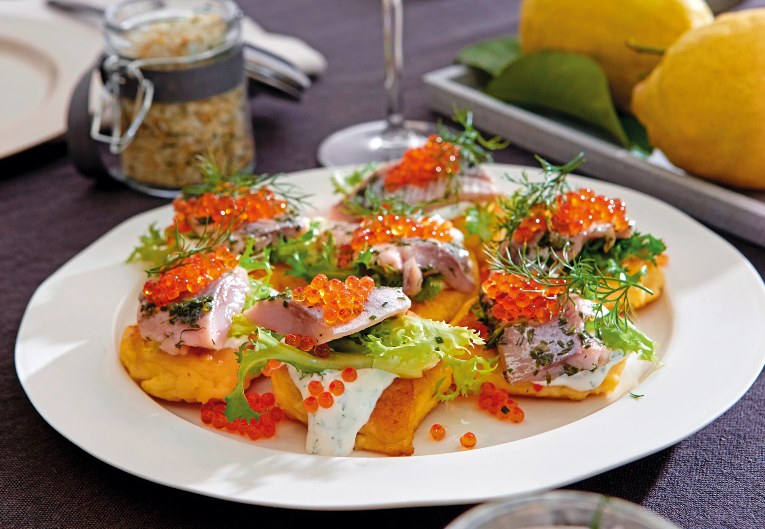 Filets trockentupfen, quer dritteln. Salat mit der Marinade mischen. Etwas Sauce, Salat und Hering auf den Laibchen verteilen, mit Kaviar und Dille garnieren. Restliche Sauce dazu reichen.