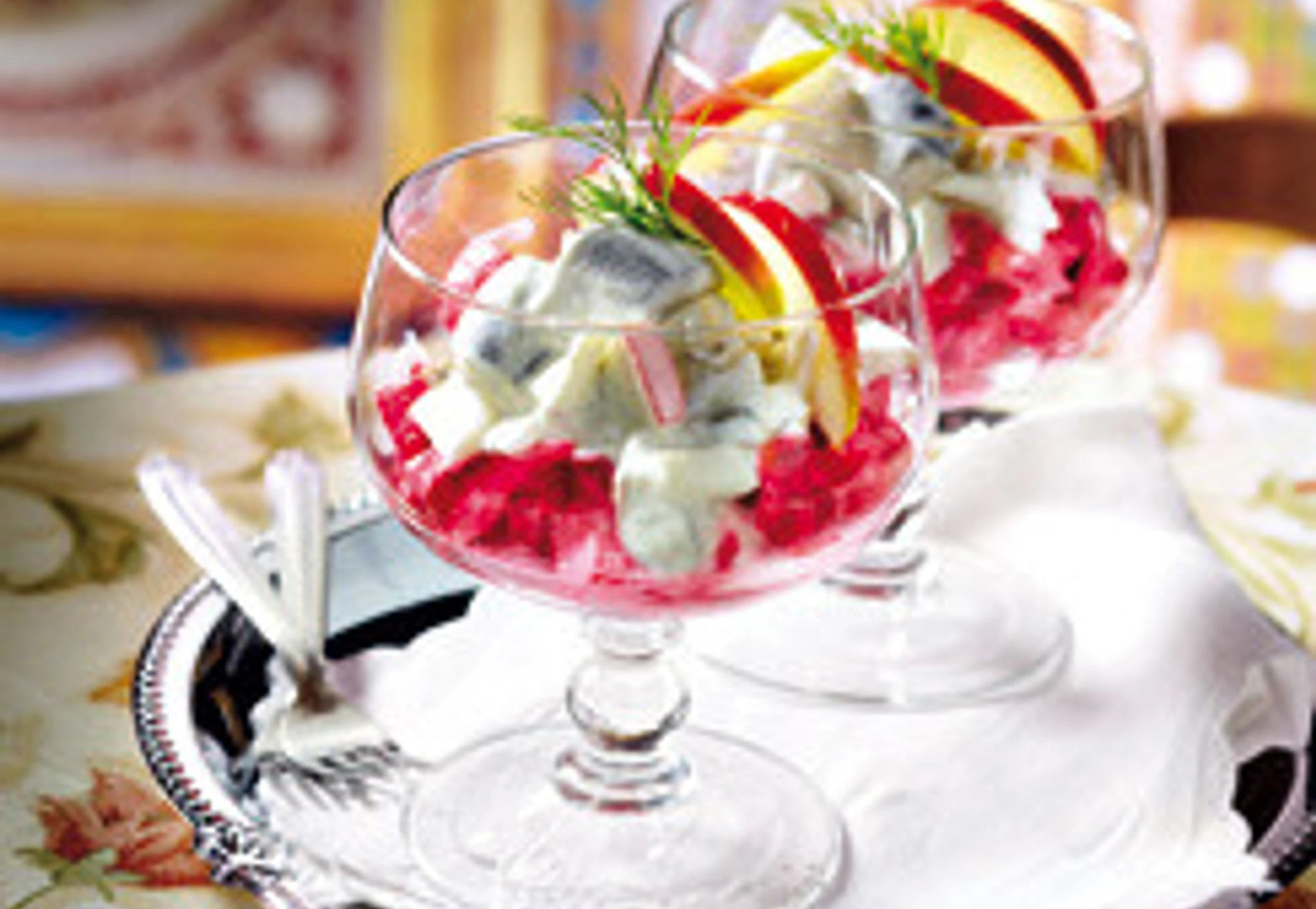 - Rüben und Erdäpfel schälen, in kleine Würfel schneiden, mit restlichem Zitronensaft und Koriander vermischen, mit Salz und Pfeffer abschmecken. Die Hälfte vom Dressing mit Roten Rüben und Erdäpfeln, restliches mit Apfelstücken, Hering und Essiggurken vermischen und ca. 30 Minuten ziehen lassen.