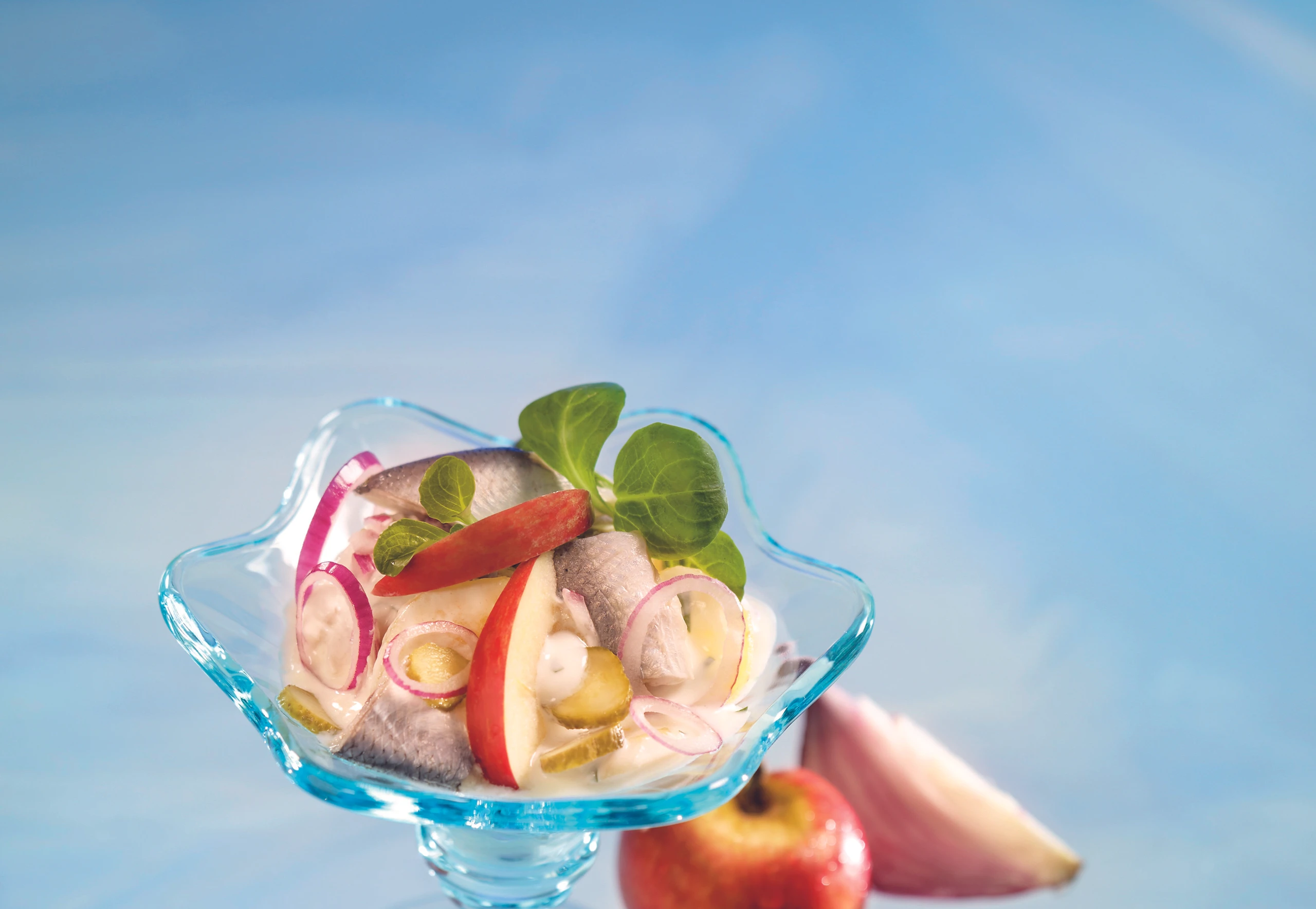 Zwiebel schälen und in feine Ringe schneiden. Apfel halbieren und das Kerngehäuse ausschneiden. Apfel in dünne Spalten schneiden. Essiggurkerln in feine Scheiben, Russenfilets in Stücke schneiden. Vogerlsalat zerpflücken.