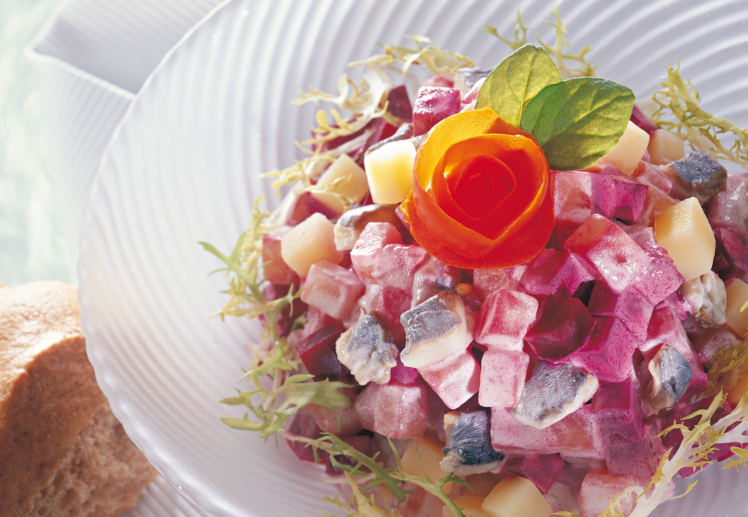 - Die Gemüsewürfel abseihen, abschrecken und gut abtropfen lassen. Heringsfilets in kleine Stücke schneiden.