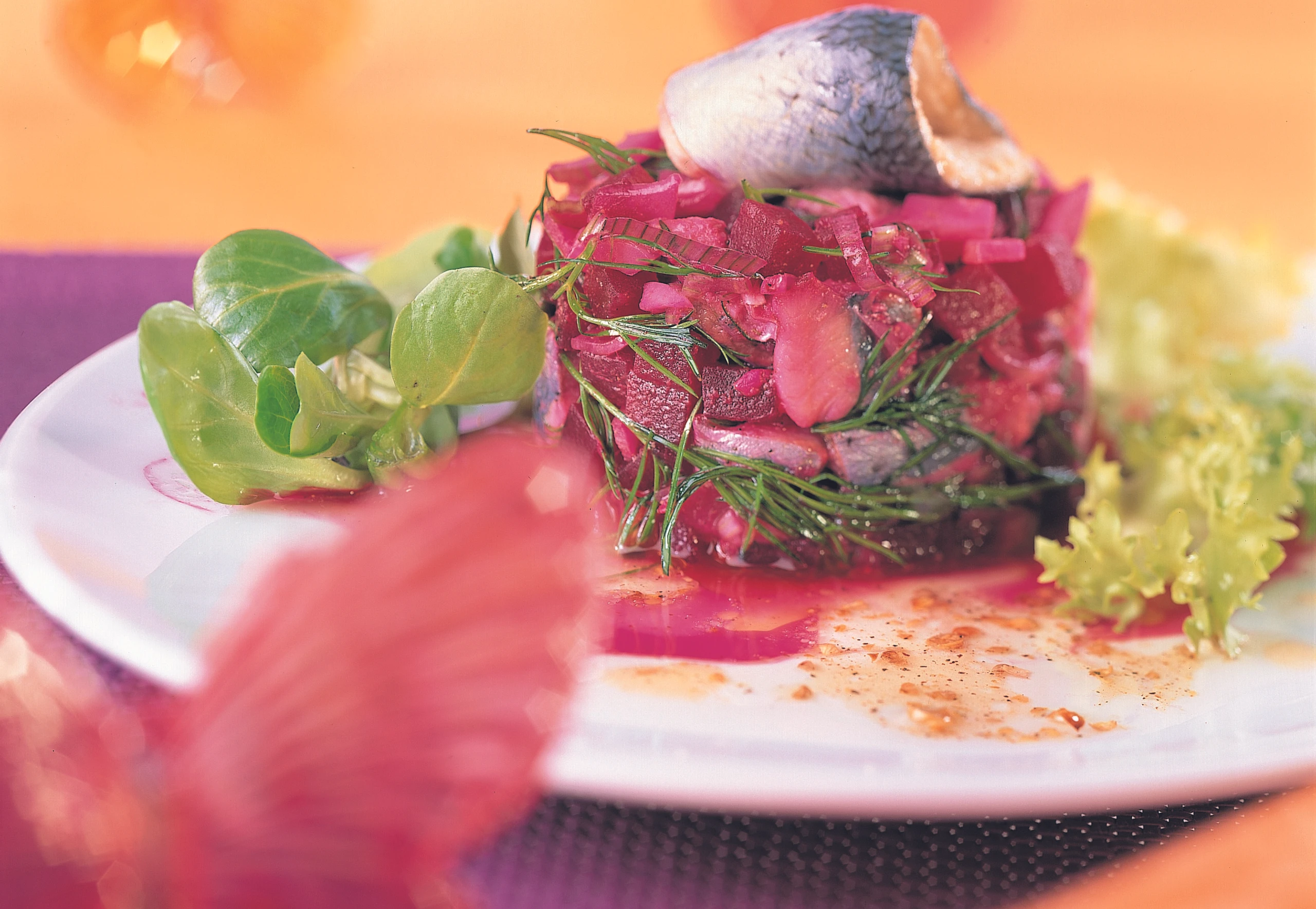 Rote Rüben in 1/2 cm große Stücke schneiden, mit Heringswürfeln, Fenchel, Jungzwiebel und Dille vermischen. Salzen und pfeffern, Zitronensaft, Öl und Apfelmus einrühren. Salat mit Frischhaltefolie zudecken und für 1 Stunde kalt stellen.