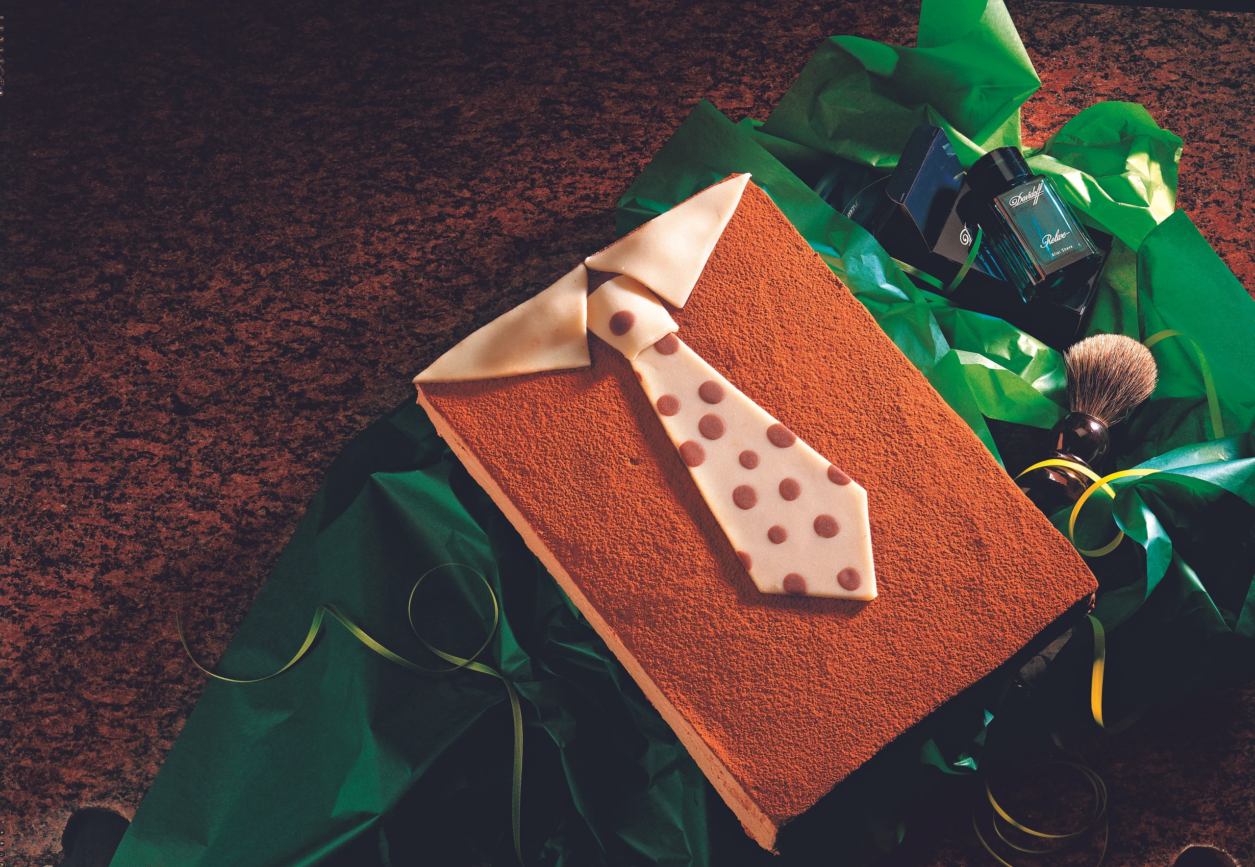 Für die Garnitur Marzipan und Staubzucker gut verkneten und auf einer mit Stärkemehl bestaubten Arbeitsfläche ca. 2 mm dick ausrollen, Hemdkragen, Krawatte und Krawattenknopf nach dem „Schnittmuster“ mit einem kleinen, scharfen Messer ausschneiden (siehe Illustrationen). Restliches Marzipan mit 1 TL Kakao gut verkneten. Aus dieser Masse formt man Kugeln mit etwa 3 mm Durchmesser. Marzipankugeln auf Krawatte und Krawattenknopf legen und mit einem Rollholz aufdrücken, sodaß eine glatte Fläche entsteht. An den beiden oberen Tortenecken den Hemdkragen ansetzen, abschließend Krawatte und Krawattenknopf auflegen. Torte vor dem Anschneiden ca. 1 Stunde in den Kühlschrank stellen.