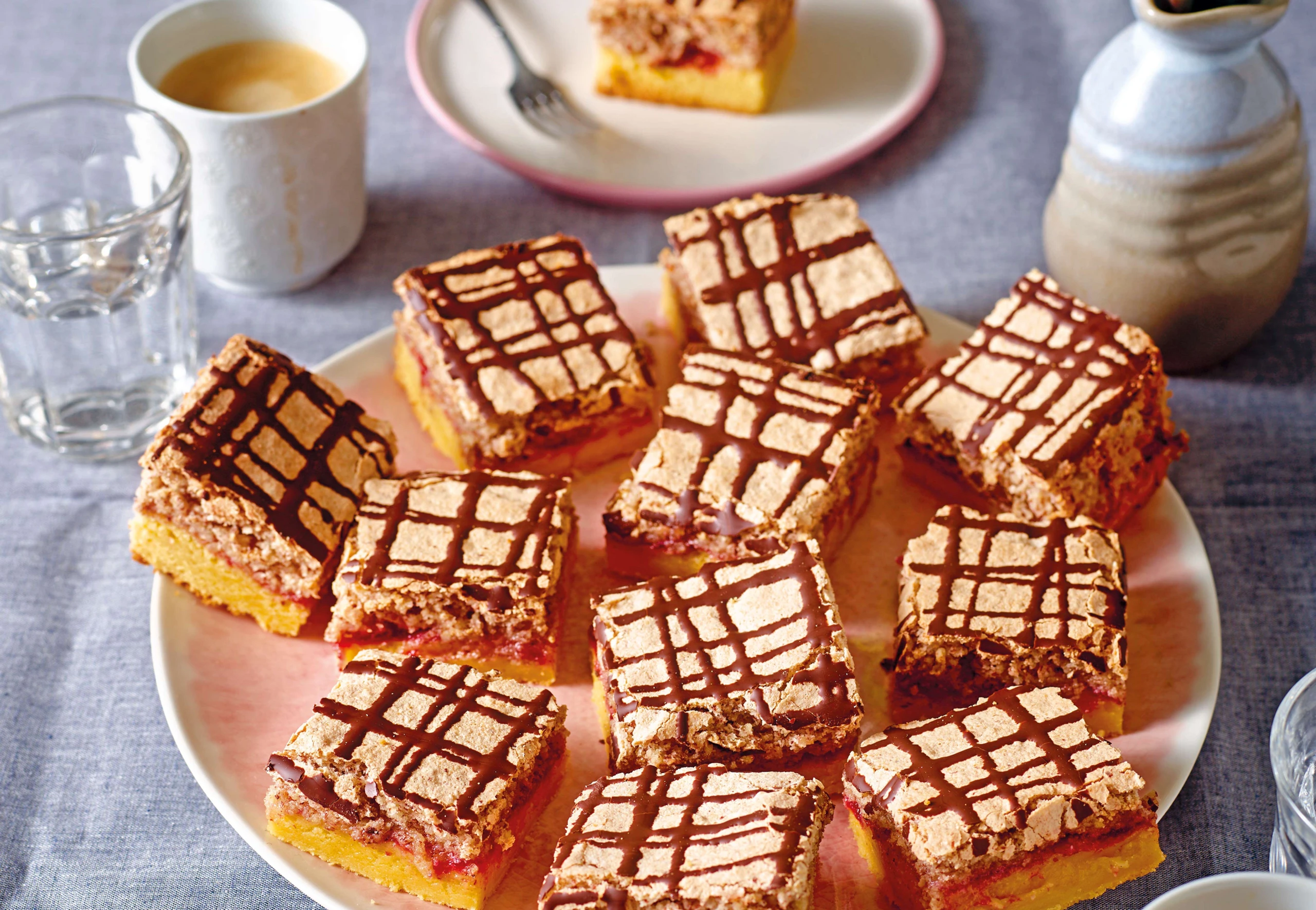 Zucker und Eiklar steif schlagen, Mandeln unterheben. Masse auf der Marmelade verstreichen. Schnitte im Rohr (mittlere Schiene) 35 bis 40 Minuten backen. Herausnehmen, auskühlen lassen.