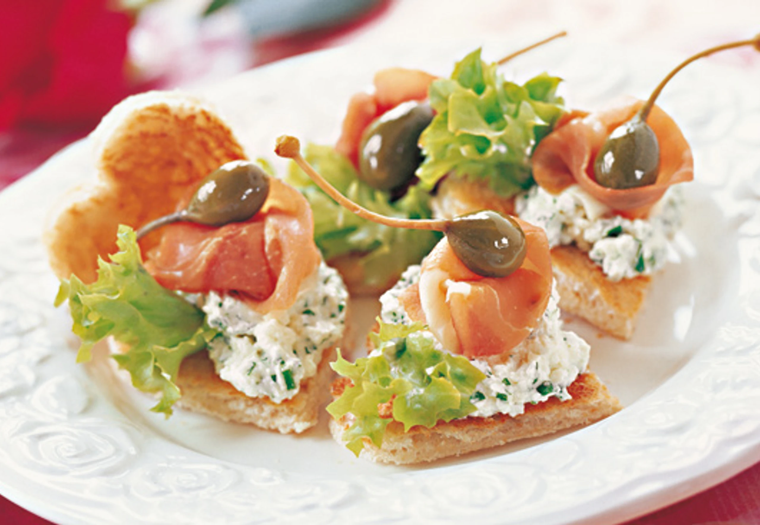 - Brot toasten und aus jeder Scheibe 2 Herzen ausstechen. Herzen mit Salat belegen, mit Frischkäse bestreichen und mit Schinken und Kapern garnieren.