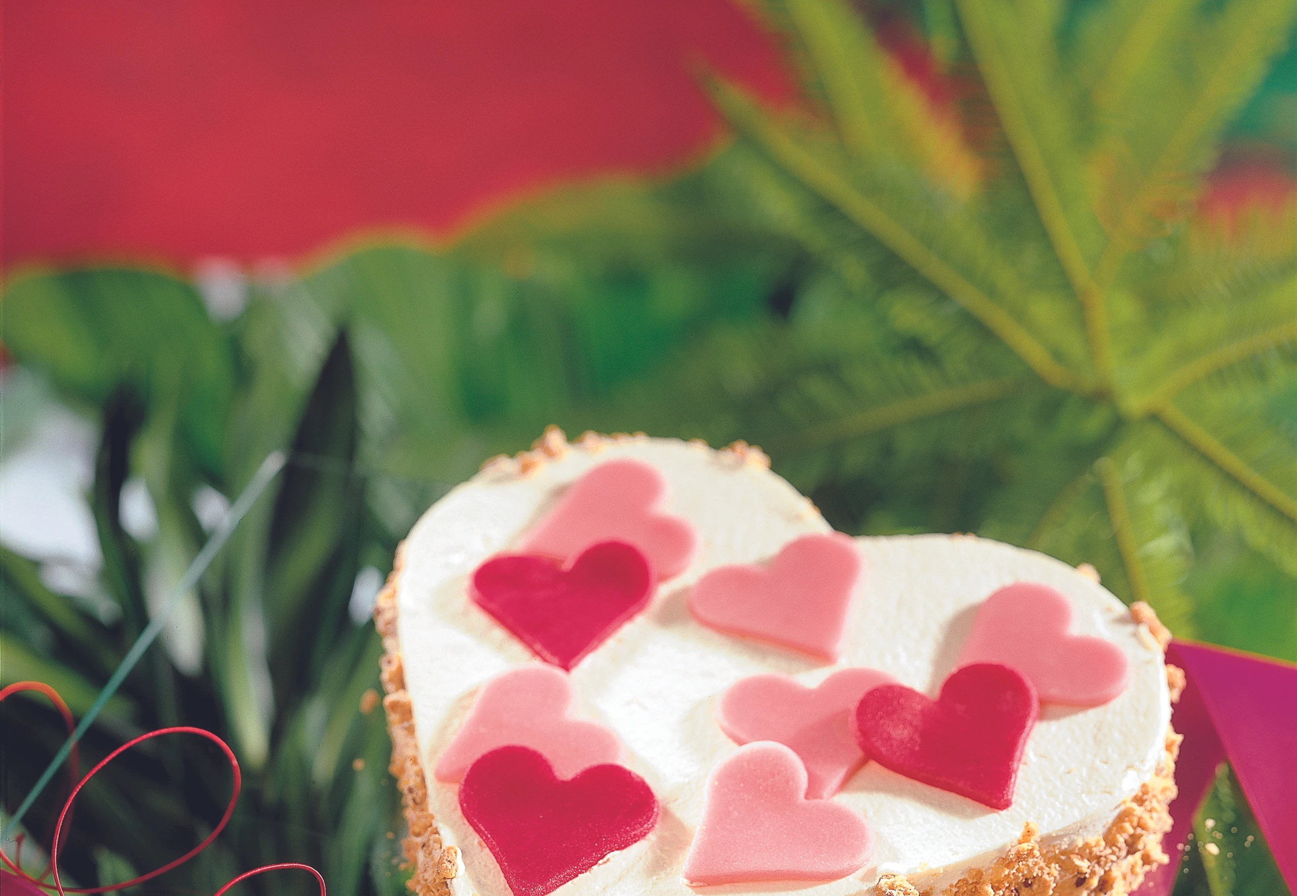 Rosa und rotes Marzipan jeweils 3 mm dick ausrollen und daraus mit einem Ausstecher (Ø 3 cm) Herzen ausstechen. Torte aus dem Kühlschrank nehmen und die Folie entfernen. Torte mit einem kleinen Messer vom Rand der Form lösen, Form abheben.