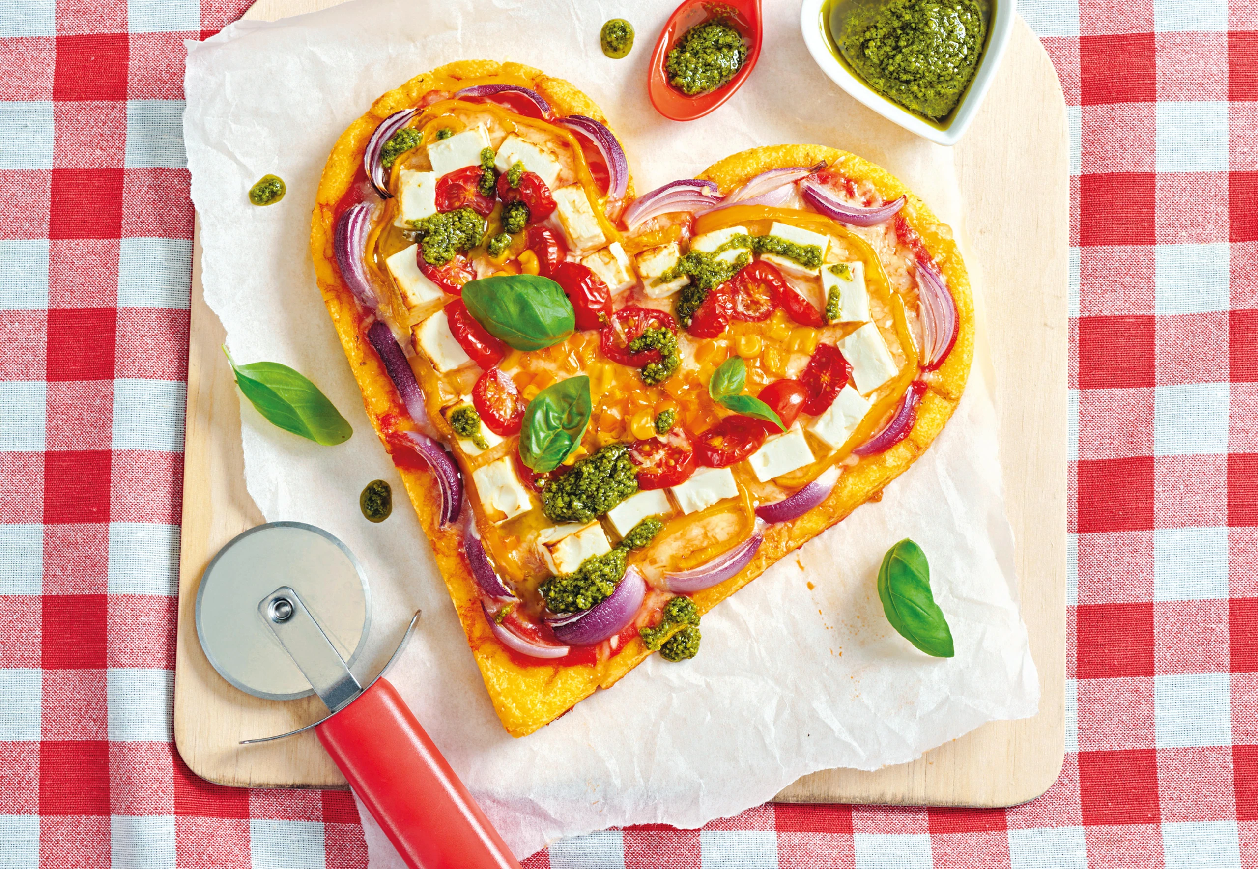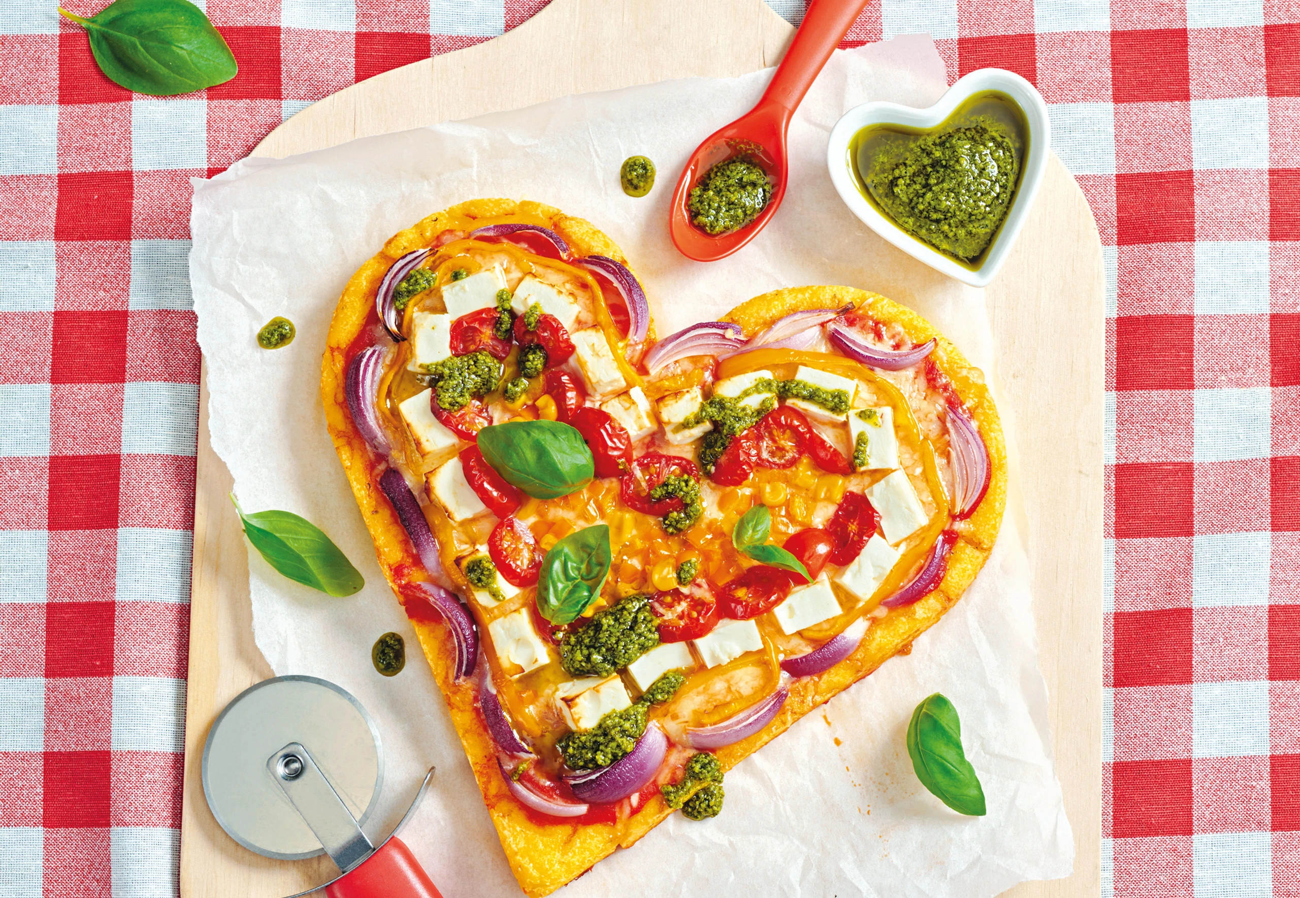 Polenta-Herzen mit Paradeissauce bestreichen, mit den Toppings belegen und mit Käse bestreuen.