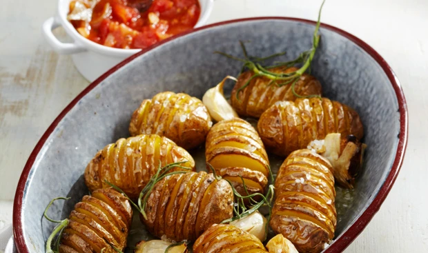 Rohr auf 200°C vorheizen. Erdäpfel waschen, gut abreiben und in knappen Abständen quer zu zwei Drittel einschneiden. Erdäpfel in eine Form legen, ungeschälte Knoblauchzehen und Rosmarin darauf verteilen, mit Olivenöl beträufeln, mit Meersalz bestreuen. Im Rohr (mittlere Schiene / Gitterrost) ca. 40 Minuten backen.