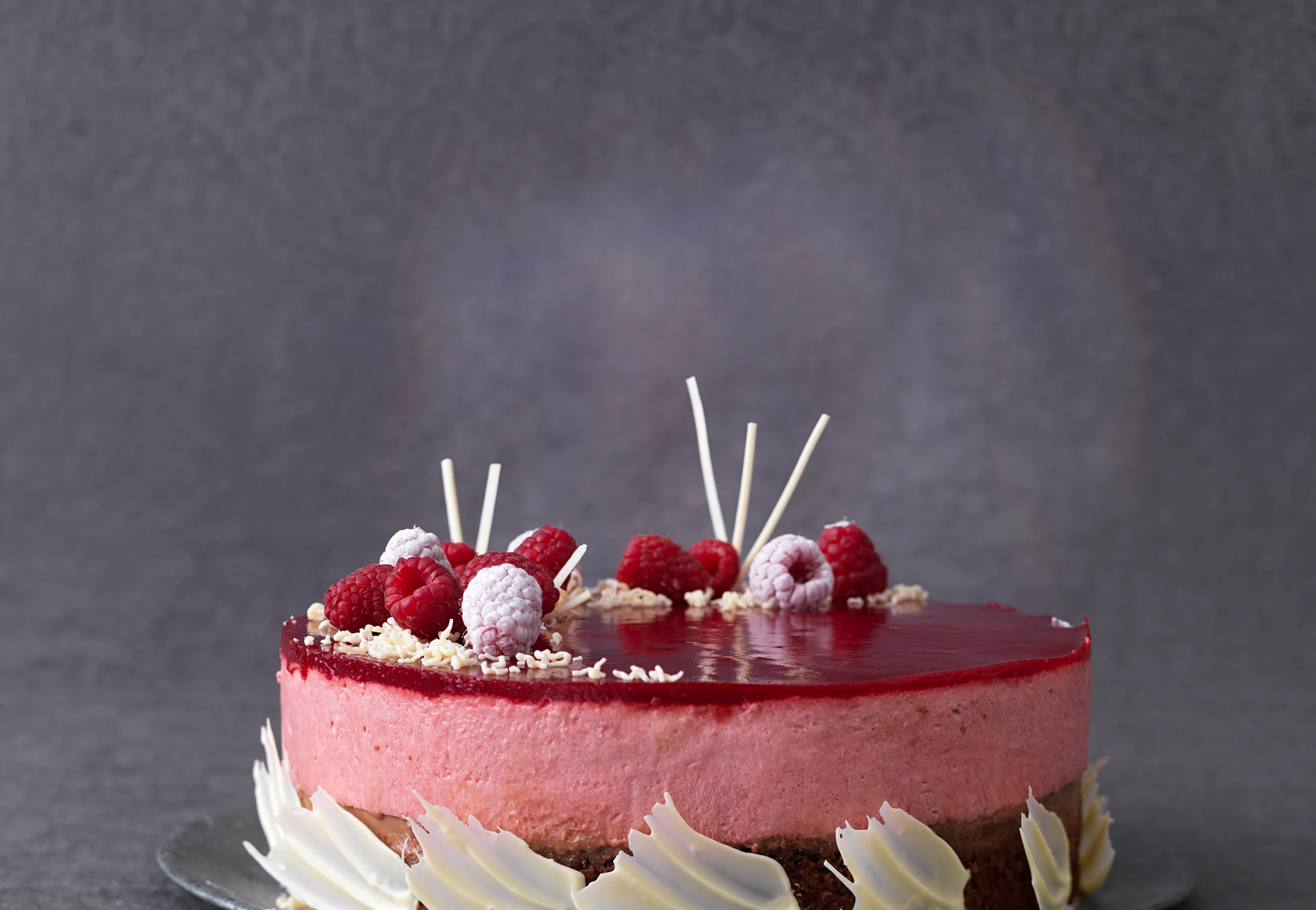 Torte von der Ringform schneiden. Ring abheben, Papier entfernen. Flügerl mit einem Tupfen geschmolzener Kuvertüre am Tortenrand fixieren. Himbeeren verlesen und die Hälfte davon in Staubzucker wälzen. Torte mit Schokostreifen und Himbeeren garnieren.