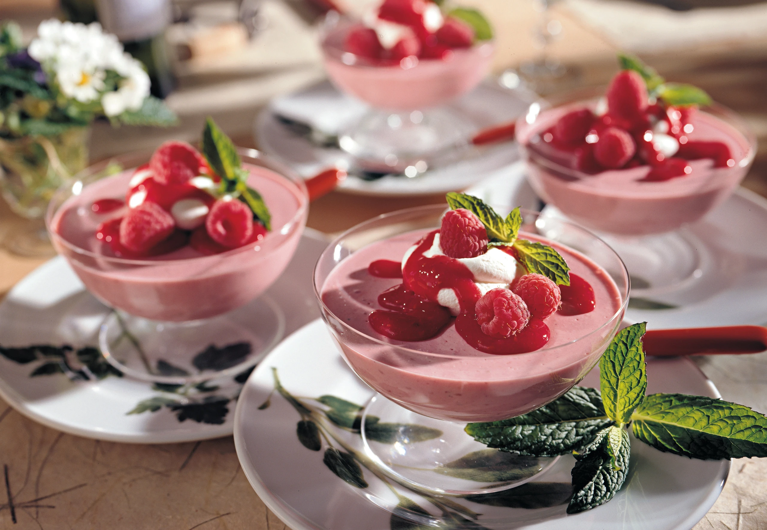 Obers für die Garnitur schlagen. Creme-Portionen mit Obers, restlichem Himbeerpüree, Himbeeren und Minzeblättern garnieren.