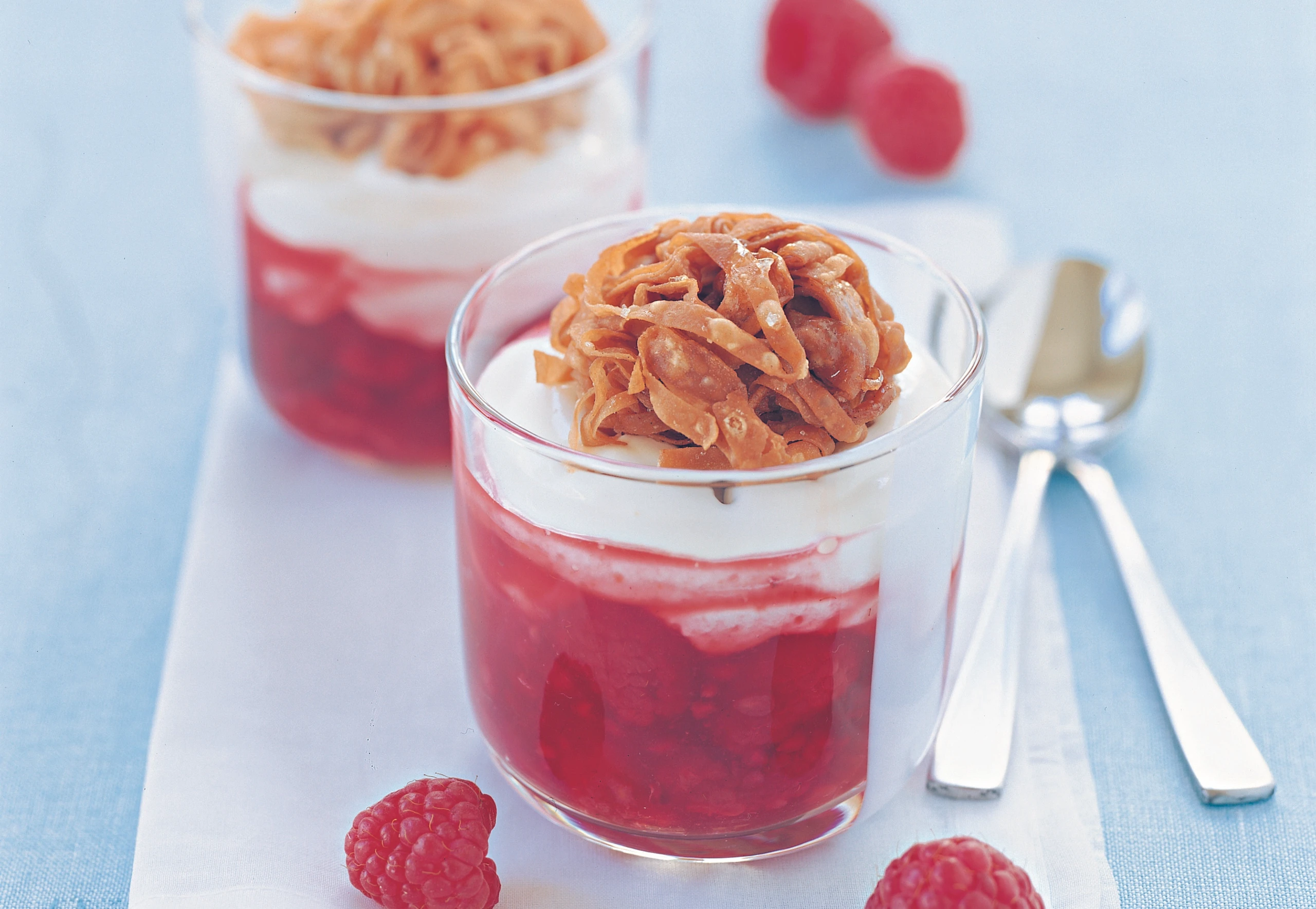Für die Creme Vanilleschote längs aufschneiden, Mark herauskratzen. Joghurt mit Vanillemark, Zucker und Zitronensaft glatt rühren. Creme abwechselnd mit der Himbeersauce in Gläser füllen.