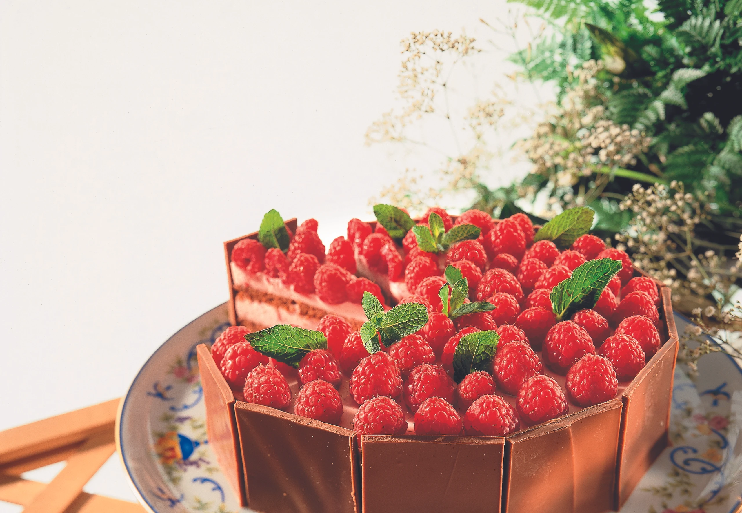 Einen Schokoladeboden (glatte Seite nach unten) in die Springform legen und mit der Hälfte der Himbeercreme bestreichen. Den zweiten Boden darauf legen und mit der übrigen Creme bestreichen. Torte mit den Himbeeren garnieren, mit Frischhaltefolie zudecken und ca. 5 Stunden kühlen.
