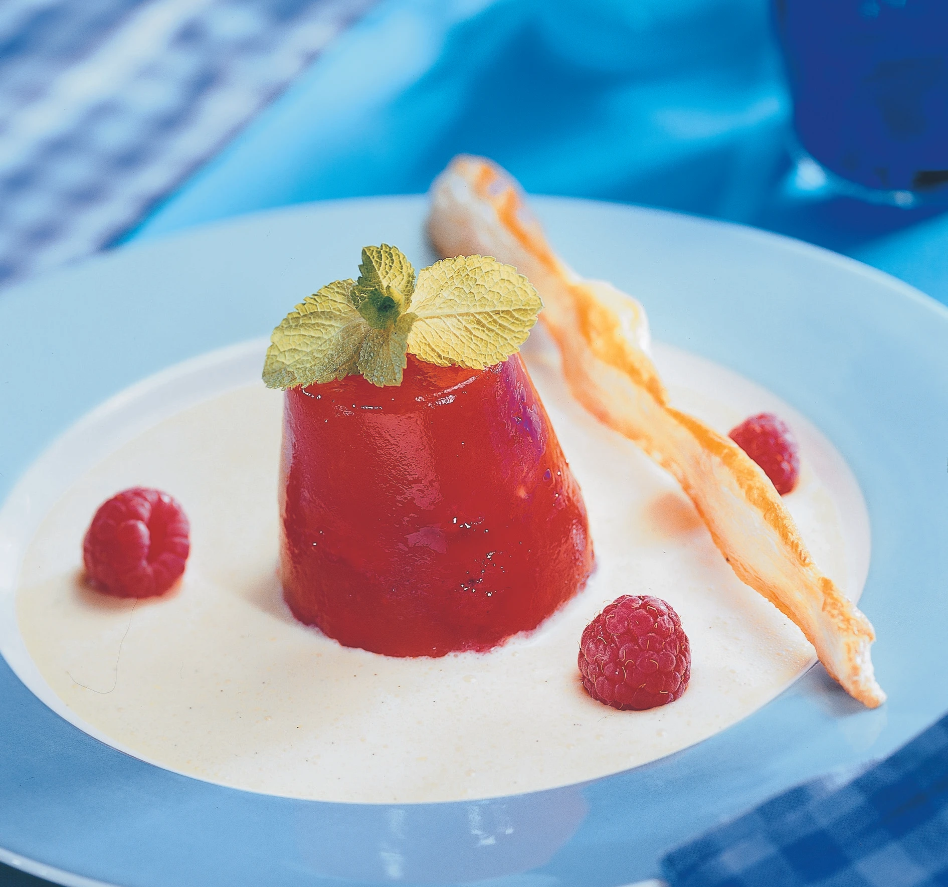 Förmchen kurz in heißes Wasser tauchen, Sülzchen auf Teller stürzen, mit der Vanillesauce, Minze, reservierten Himbeeren und mit Blätterteigstangerln (siehe Rezept) garniert servieren.