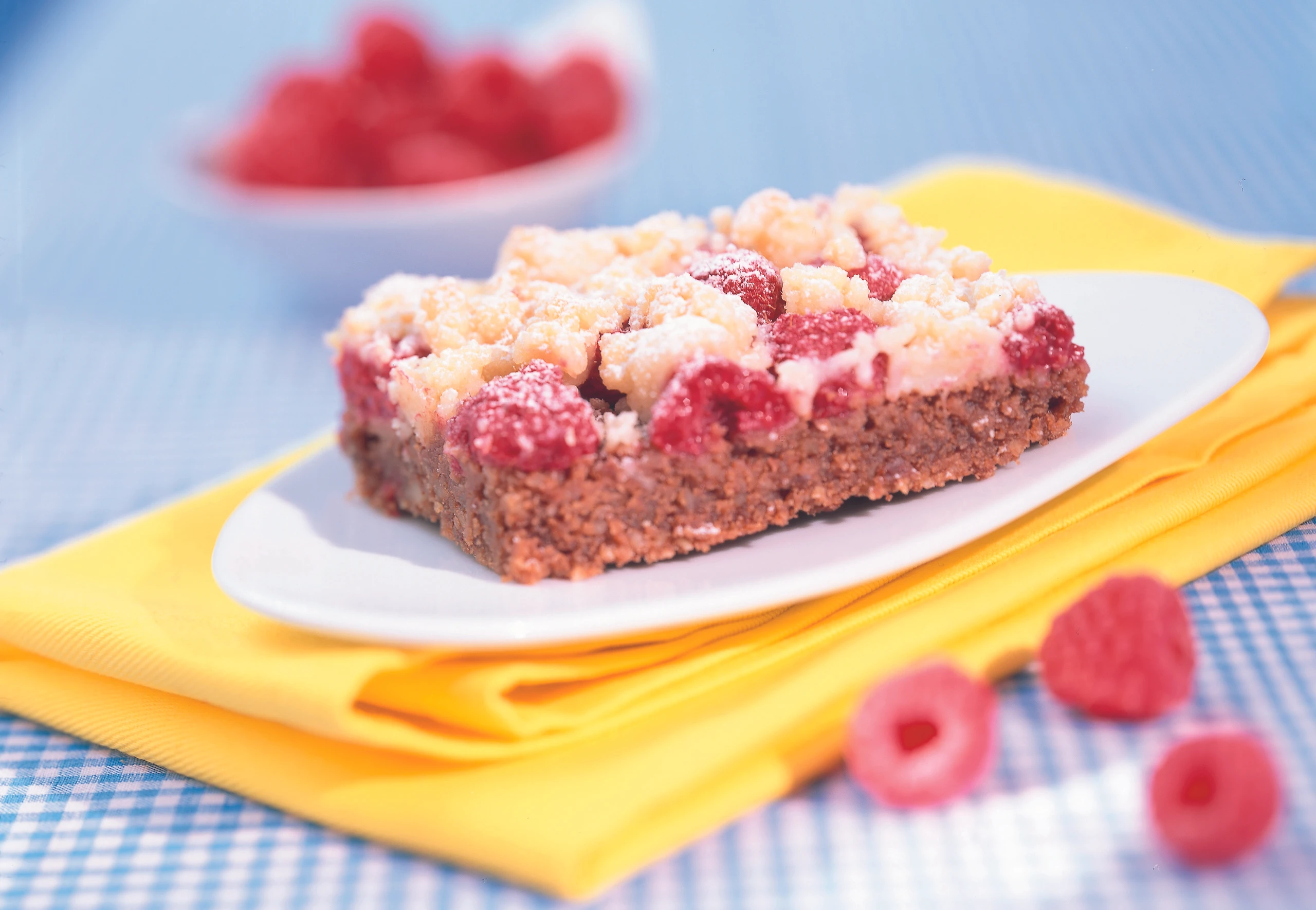 Inzwischen die Streuselmasse grob reiben (Reibe oder Nockerlhobel). 4 Teig mit den Himbeeren bestreuen, Streusel darauf verteilen, den Kuchen ca. 20 Minuten fertig backen.