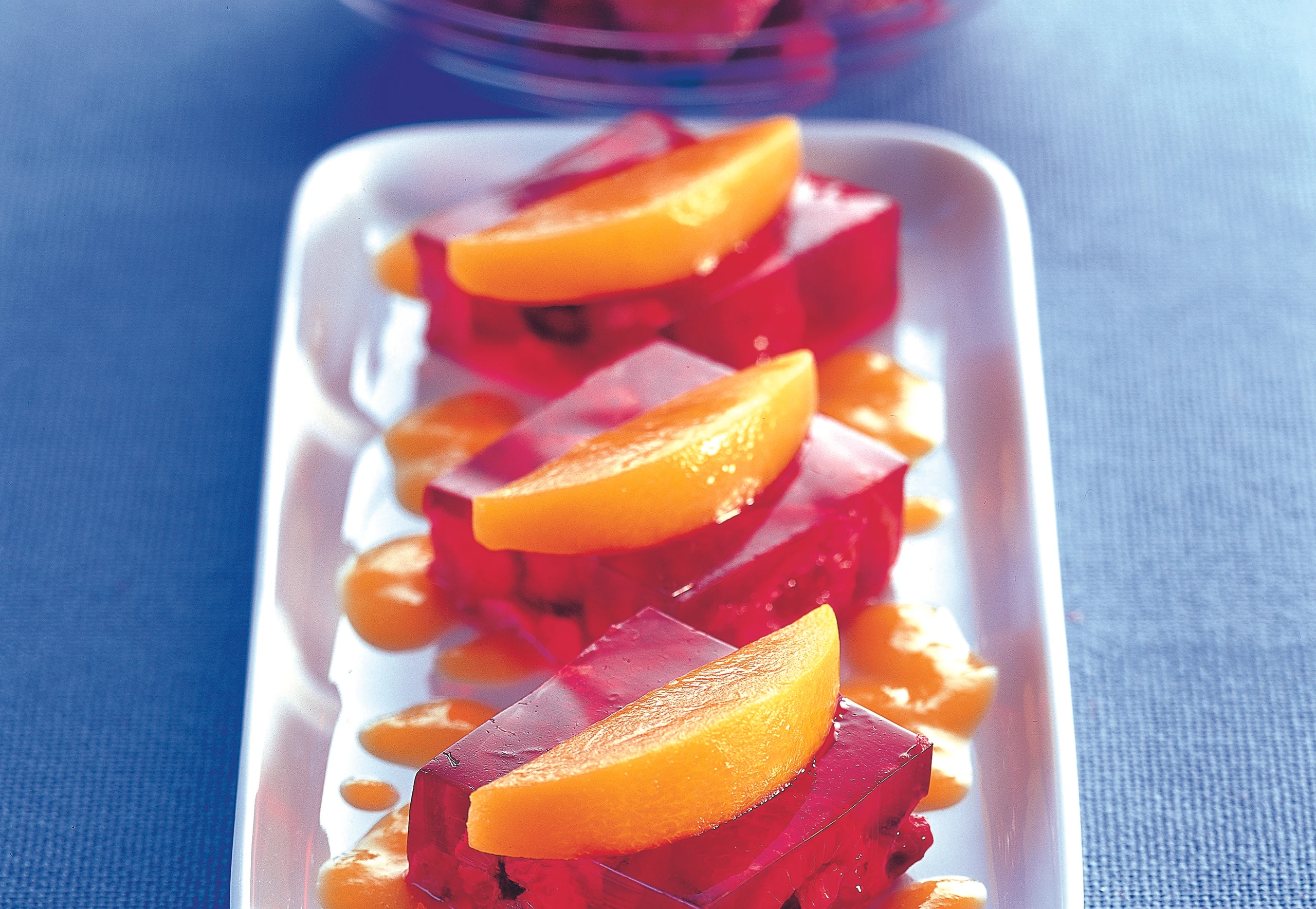 Himbeergelee aus der Form stürzen, Folie abziehen und das Gelee in 36 Quadrate (4 x 4 cm) schneiden. Gelee mit der Sauce auf Tellern anrichten, mit Pfirsichspalten garniert servieren.