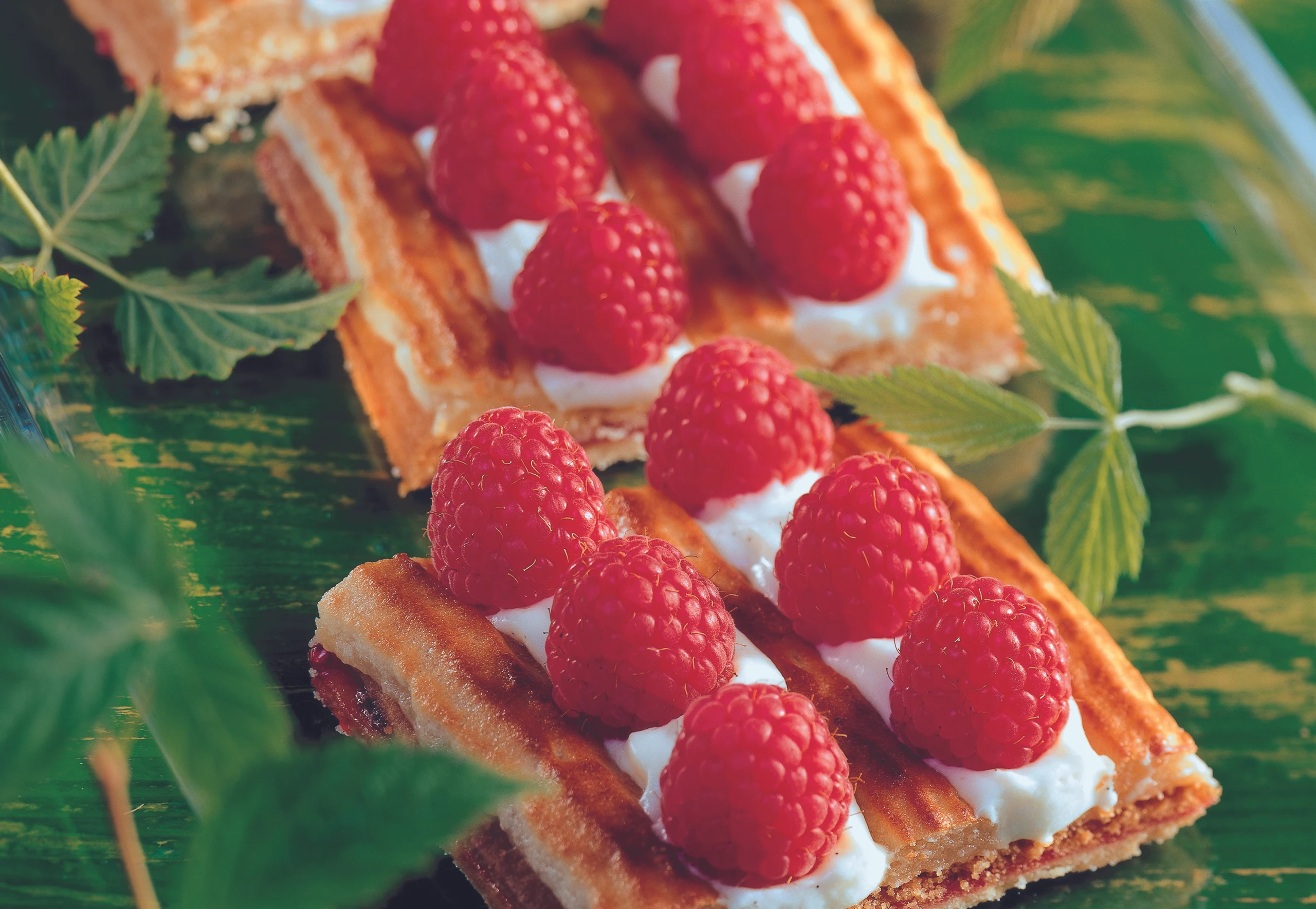 Himbeeren verlesen. Vanillecreme in einen Dressiersack (mit großer, glatter Tülle) füllen und in die Freiräume zwischen den Marzipanstreifen dressieren. Schnitte mit den Himbeeren belegen und in Stücke schneiden.