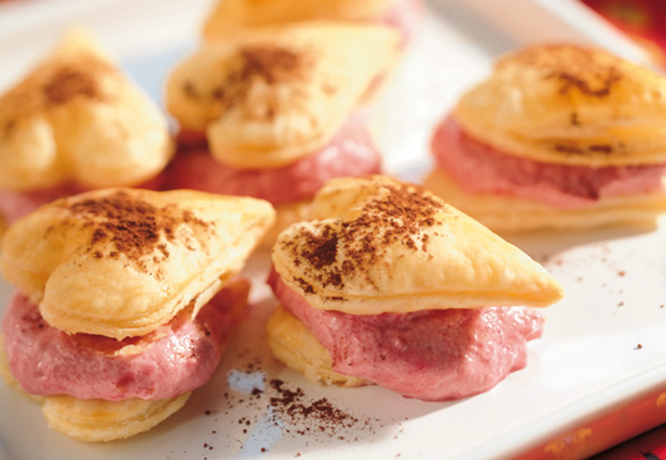 Himbeeren mit Zitronensaft und Zucker vermischen und mit einem Stabmixer pürieren. Obers mit Sahnesteif aufschlagen, Himbeermark unterheben. Jeweils zwei Herzen mit Himbeercreme zusammensetzen, mit Kakao oder Staubzucker bestreut servieren.