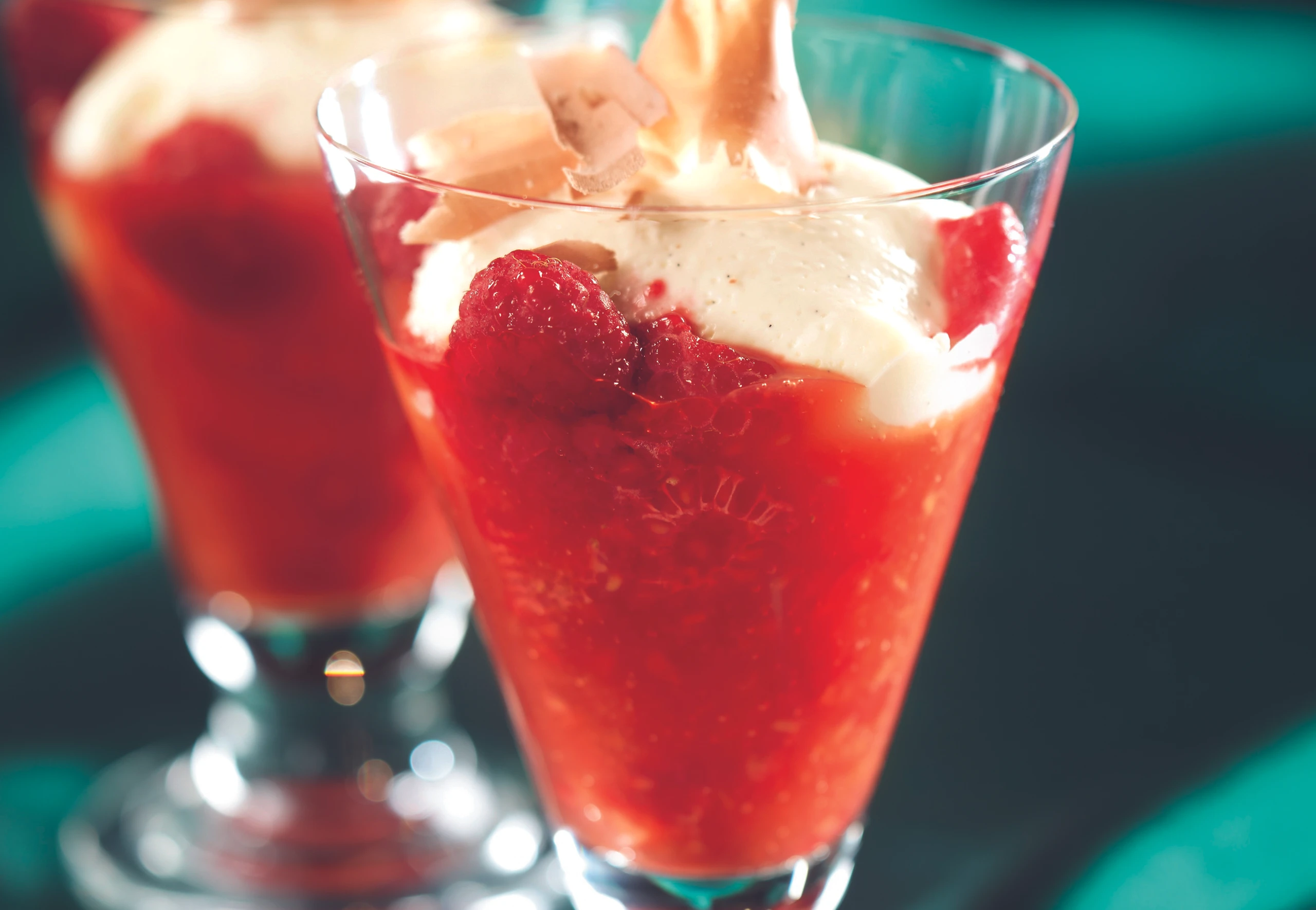 - Stärke mit 4 EL Wasser vermischen. Orangen auspressen. Orangensaft und Saft von 1/2 Zitrone mit Zucker und 150 g von den Himbeeren aufkochen, Stärke einrühren und nochmals kurz aufkochen. Mischung vom Herd nehmen und ca. 20 Minuten abkühlen lassen. Übrige Himbeeren einrühren.