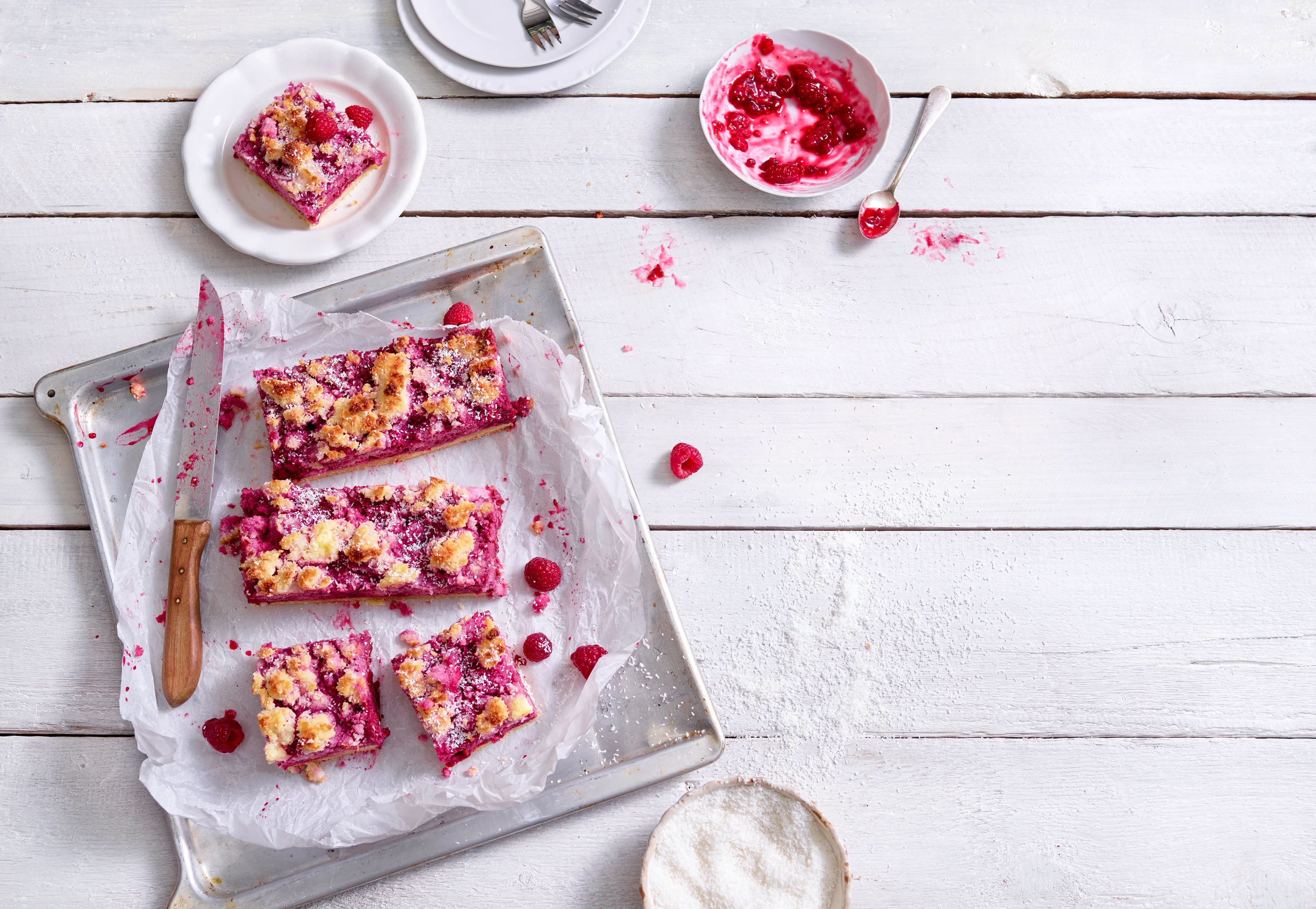Himbeerfüllung auf dem Boden verteilen und Topping darüber streuen. Kuchen im Rohr (mittlere Schiene) ca. 40 Minuten backen.
