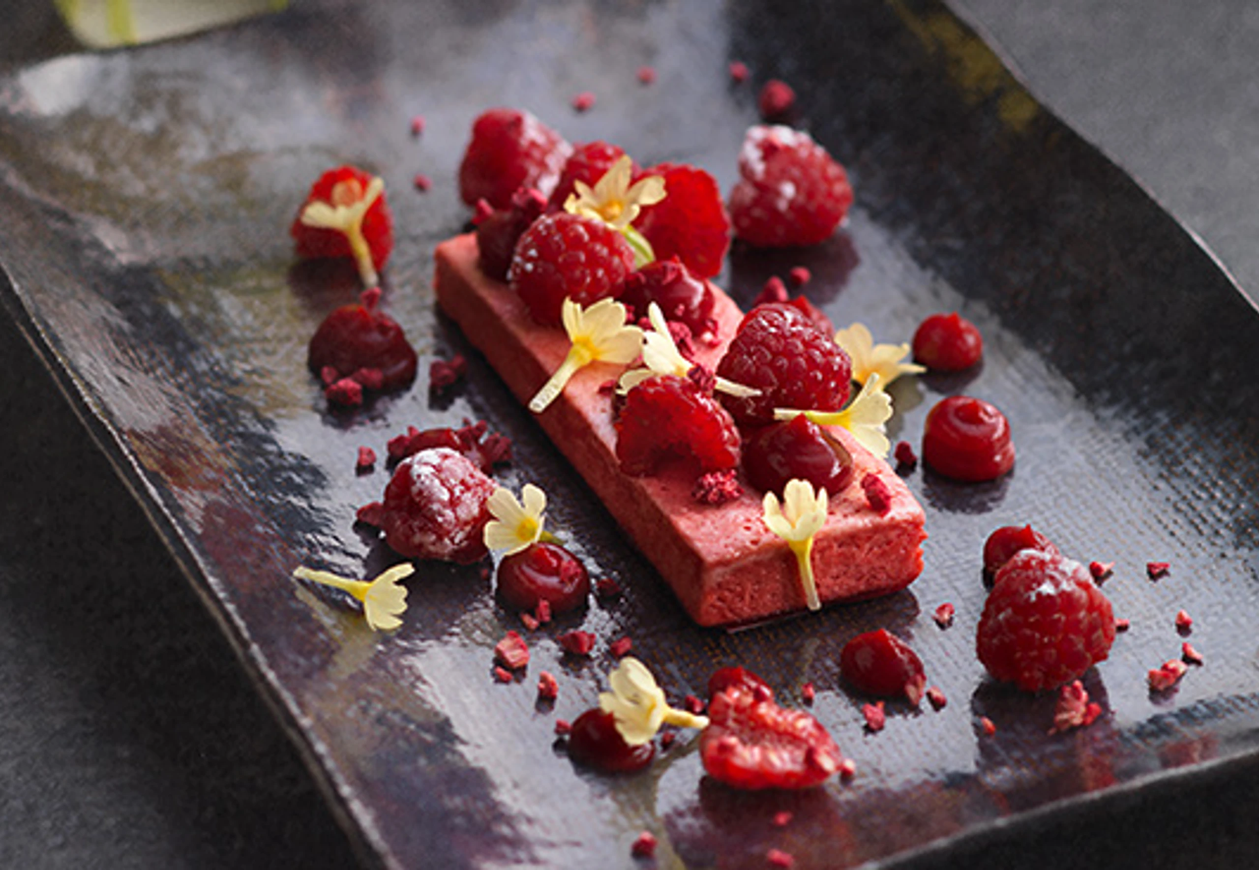Parfait aus der Form stürzen und die Folie abziehen. Parfait portionieren, anrichten und mit Himbeeren und Schlüsselblumen garnieren. Gelee in einen Dressiersack füllen (glatte Tülle) und in Tupfen auf die Teller dressieren.