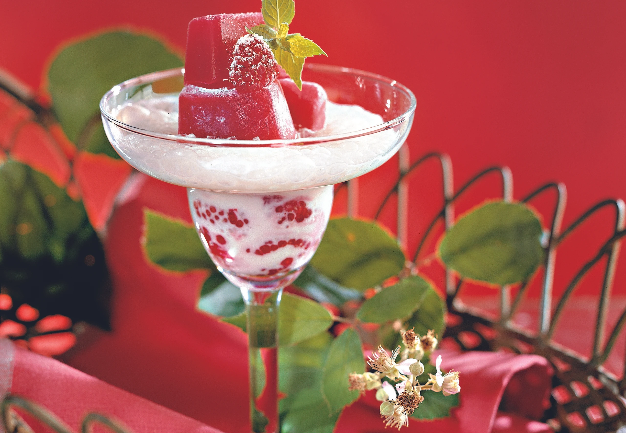 - Für das Eis Himbeeren mit Zucker vermischen, aufkochen und durch ein Sieb passieren. Gelatine in kaltem Wasser einweichen, ausdrücken und im heißen Himbeermus auflösen. Zitronensaft und Sekt einrühren. Mischung in Eiswürfel-Formen füllen und gefrieren lassen.