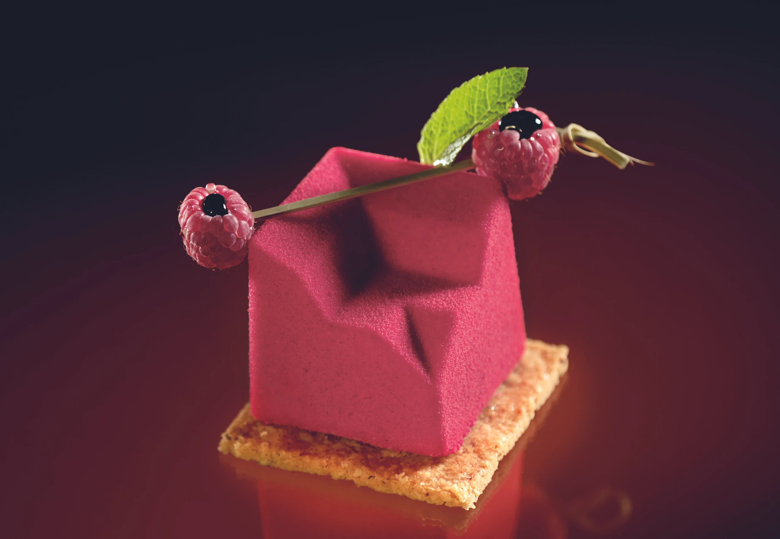 Für die Glasur Kuvertüre klein hacken, mit Öl im Wasserbad schmelzen, mit Lebensmittelfarbe rot einfärben. Mousse aus den Formen drücken, mit Glasur überziehen und auf die Teigquadrate setzen. Für die Garnitur jeweils 2 Himbeeren auf einen Bambusspieß stecken und vorsichtig auf die Mousse legen. Himbeeren mit einigen Tropfen Balsamicoreduktion füllen und mit Minze dekorieren.