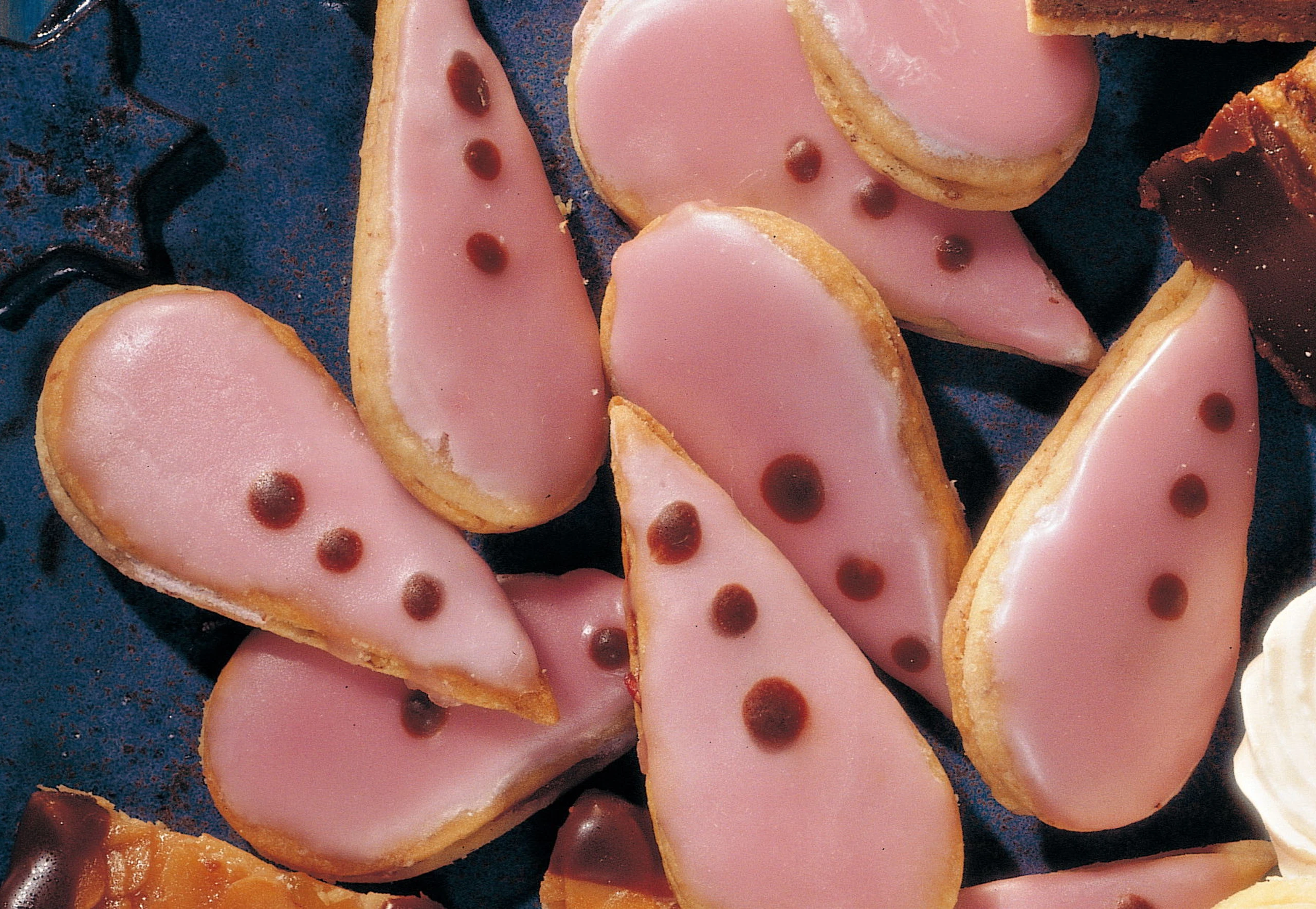 Teig auf einer leicht bemehtlen Arbeitsfläche messerrückendick ausrollen und mit einem Tropfen-Ausstecher (ca. 7 x 3 cm) Kekse ausstechen. Kekse auf die Backbleche legen und im vorgeheizten Rohr (mittlere Schiene) 12–15 Minuten backen. Die Kekse auskühlen lassen.