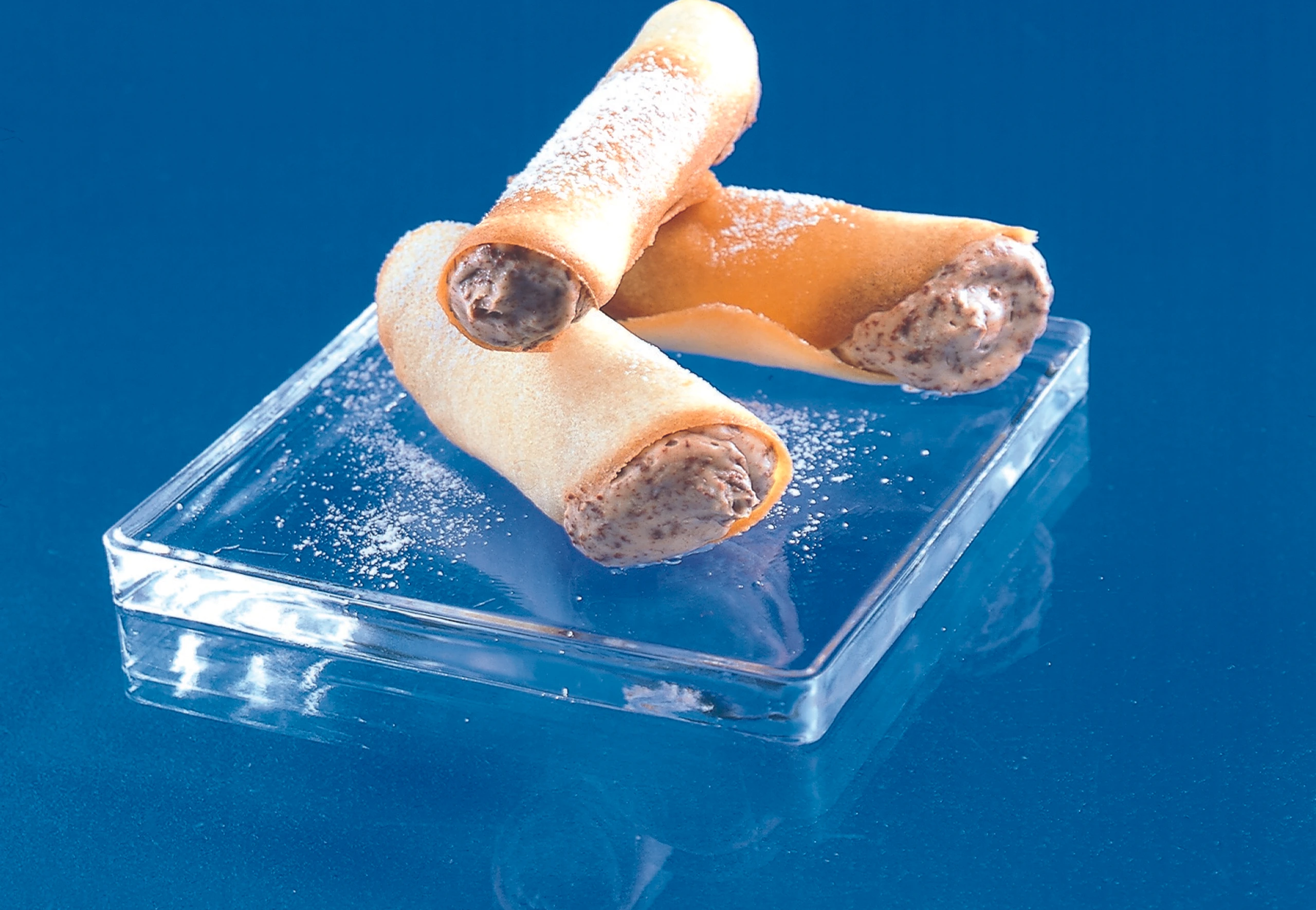 Scheiben im Rohr (mittlere Schiene) 4–5 Minuten backen. Vom Blech lösen, über dem Stiel eines Schneebesens sofort zu Röllchen formen und auskühlen lassen.