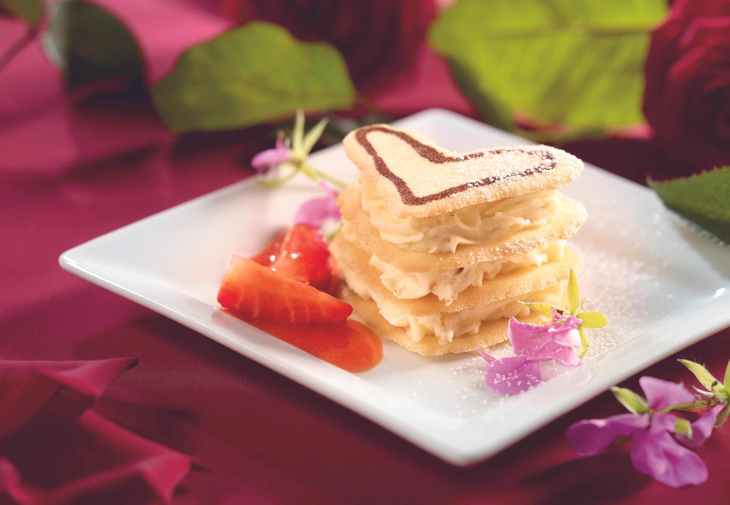 Hippenherzen mit Staubzucker bestreuen und mit Pelargonien garniert servieren. Dazu passt Erdbeer-Ragout.