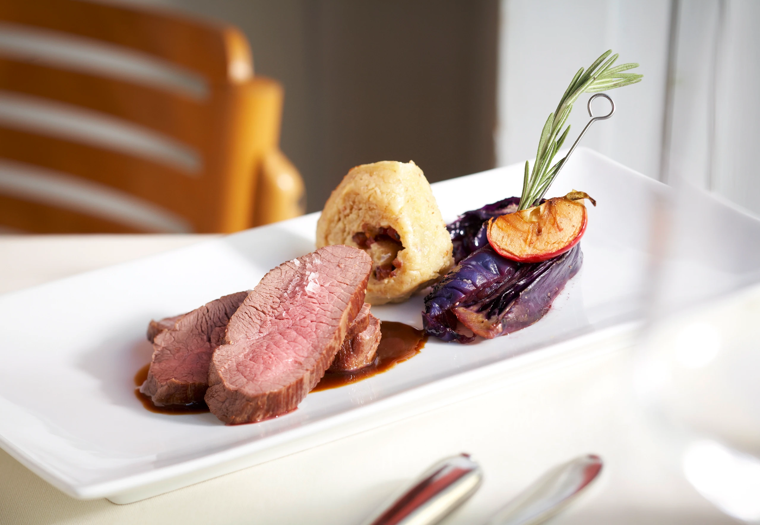 - Fleisch herausnehmen und warm stellen. Bratrückstand mit Bratensaft aufgießen und aufkochen. Fleisch portionieren, mit Saft, Buchteln und Kraut anrichten.