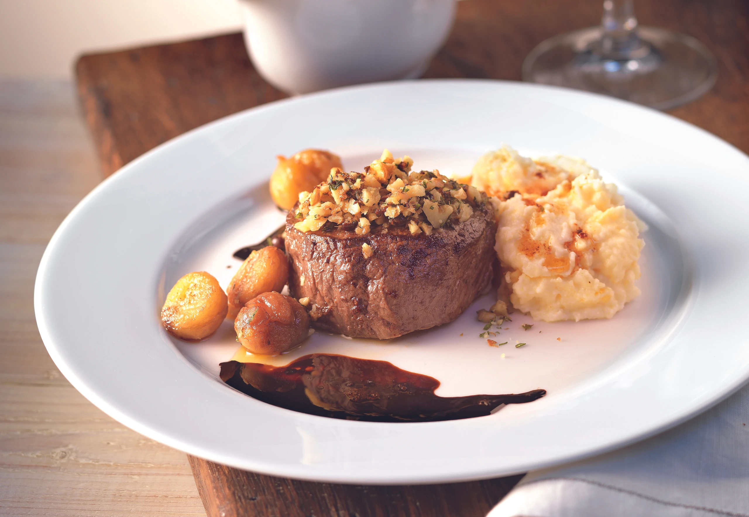 Bratfett abgießen. Im Bratrückstand Butter erhitzen und mit Gin ablöschen. Wildfond zugießen und aufkochen. Fleisch mit dem Fond anrichten, mit Nusskräutern bestreuen und mit Maroni servieren. Dazu passt Selleriepüree mit brauner Butter beträufelt.