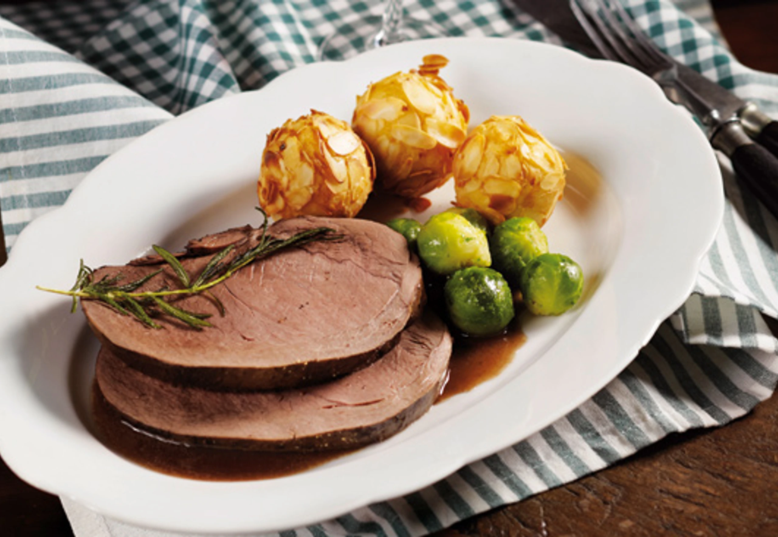 Braten herausnehmen, Spagat entfernen. Bratensaft abseihen (sollte ca. 375 ml sein, evtl. mit Suppe auffüllen). Fleisch in Scheiben schneiden, mit Saft und Mandelbällchen anrichten. Dazu passen Kohlsprossen.