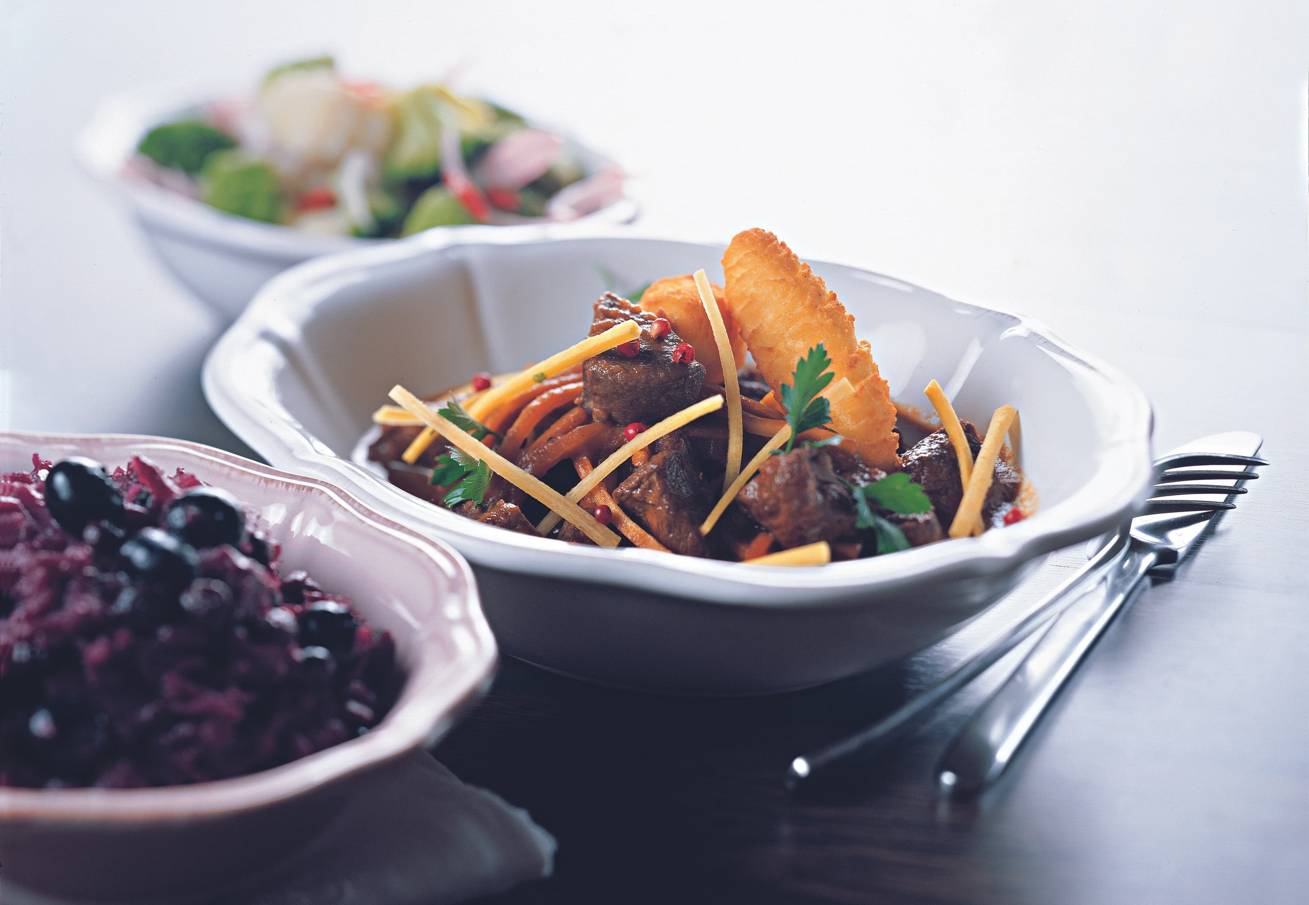 Obers und die zweite Packung Streifengemüse zugeben und noch 6 Minuten köcheln. Lorbeer entfernen, Kompott einrühren. Ragout mit Rotkraut servieren. Dazu passen Kroketten.
