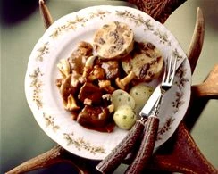 Hirschragout mit Schwammerln und Zwetschken-Serviettenknödel