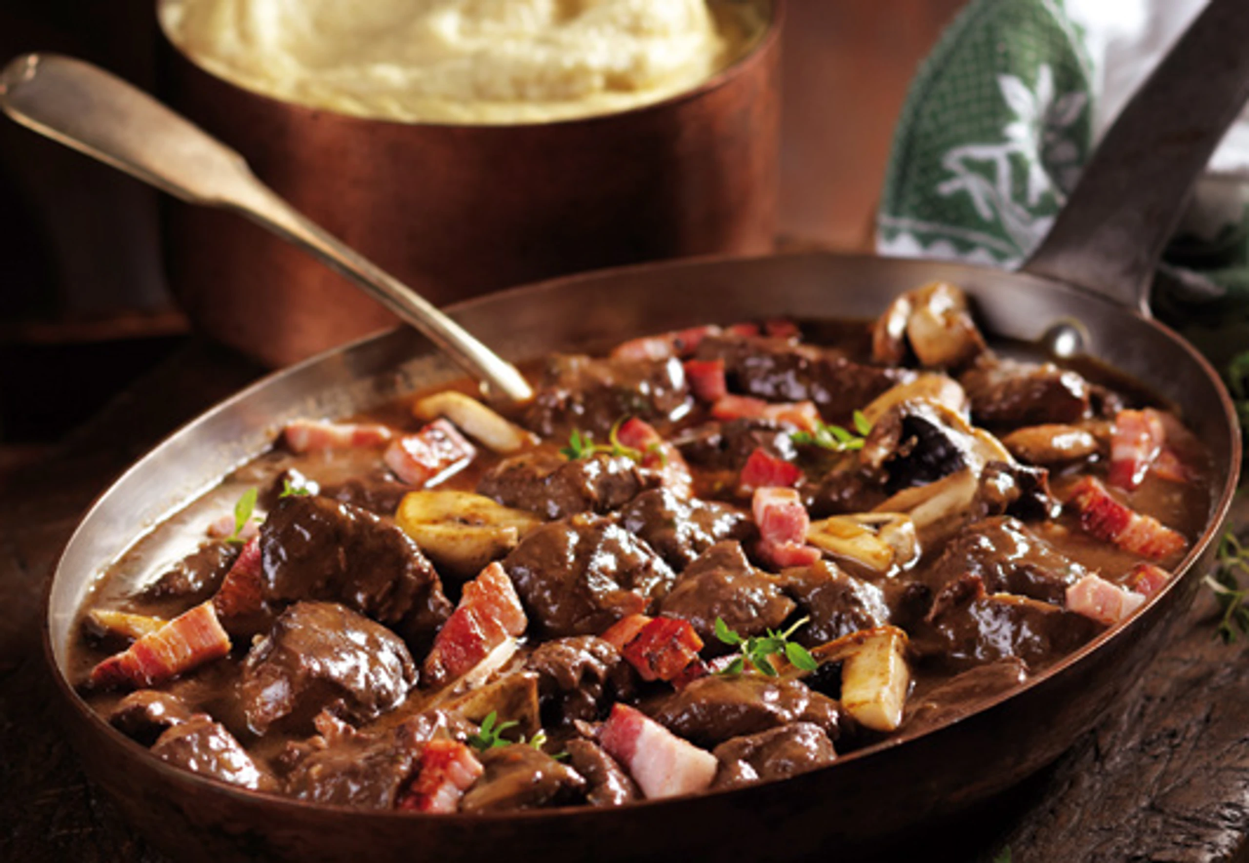 - Fleisch herausnehmen, Sauce pürieren. Fleisch wieder in die Sauce geben. Für die Garnitur Champignons putzen und in Stücke schneiden. Rote Zwiebeln schälen und in Spalten schneiden. Speck in 2 cm breite Stücke schneiden. Speck, Zwiebeln und Pilze in der Butter anbraten, salzen und pfeffern. Ragout mit der Garnitur anrichten. Als Beilage passt Selleriepüree.