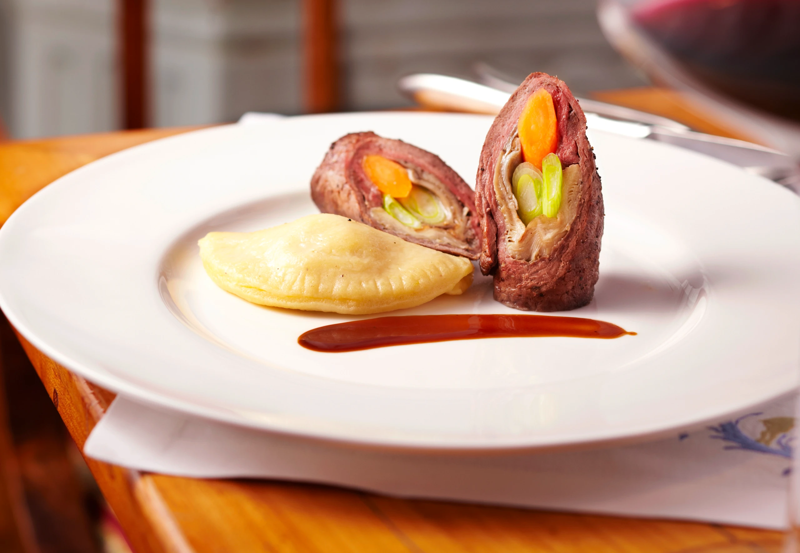 Hirschroulade mit Gemüsefülle und Erdäpfeltascherln