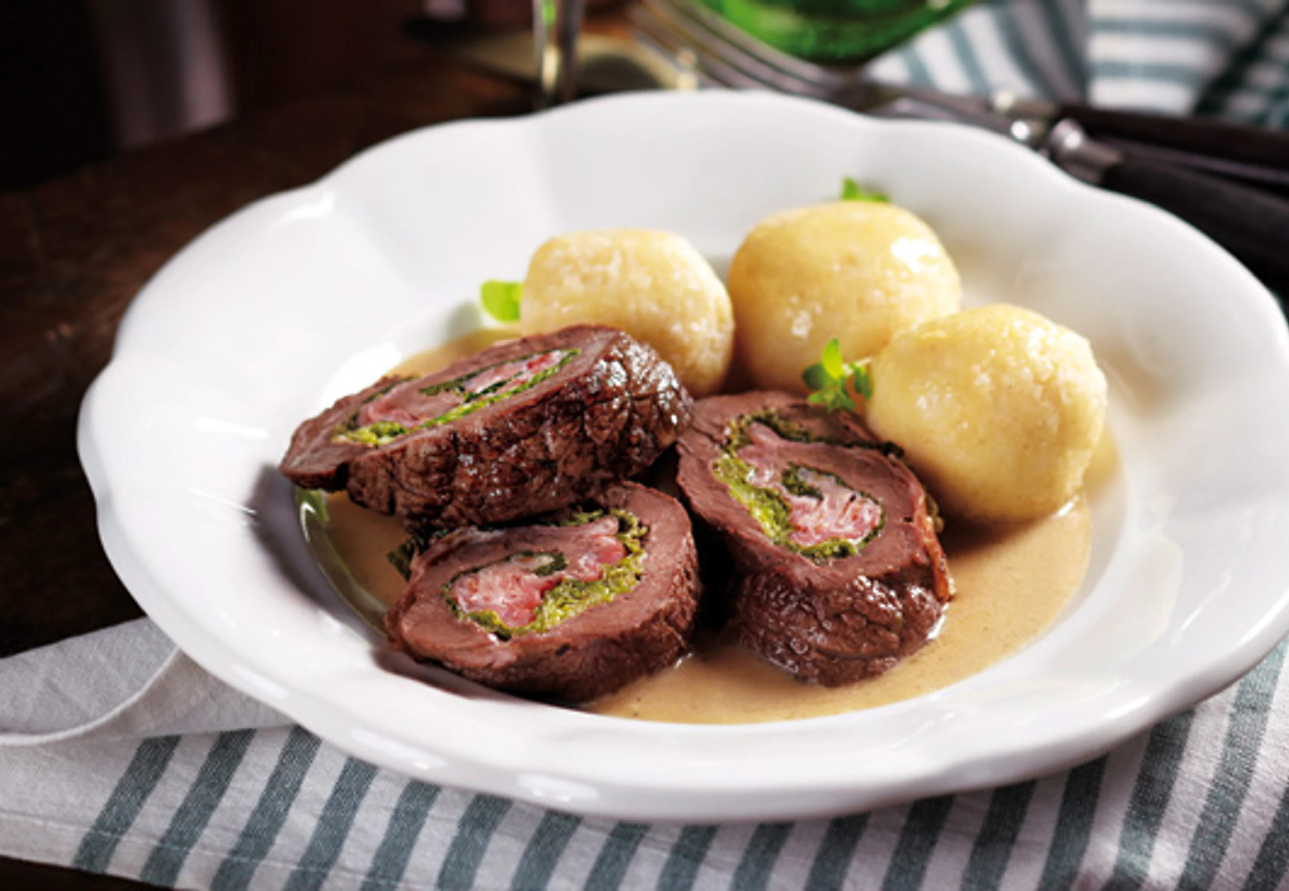Rouladen herausheben, Spagat entfernen. Obers zum Bratensaft gießen. Sauce cremig einkochen und abseihen. Rouladen aufschneiden, mit Sauce und Knödeln anrichten.