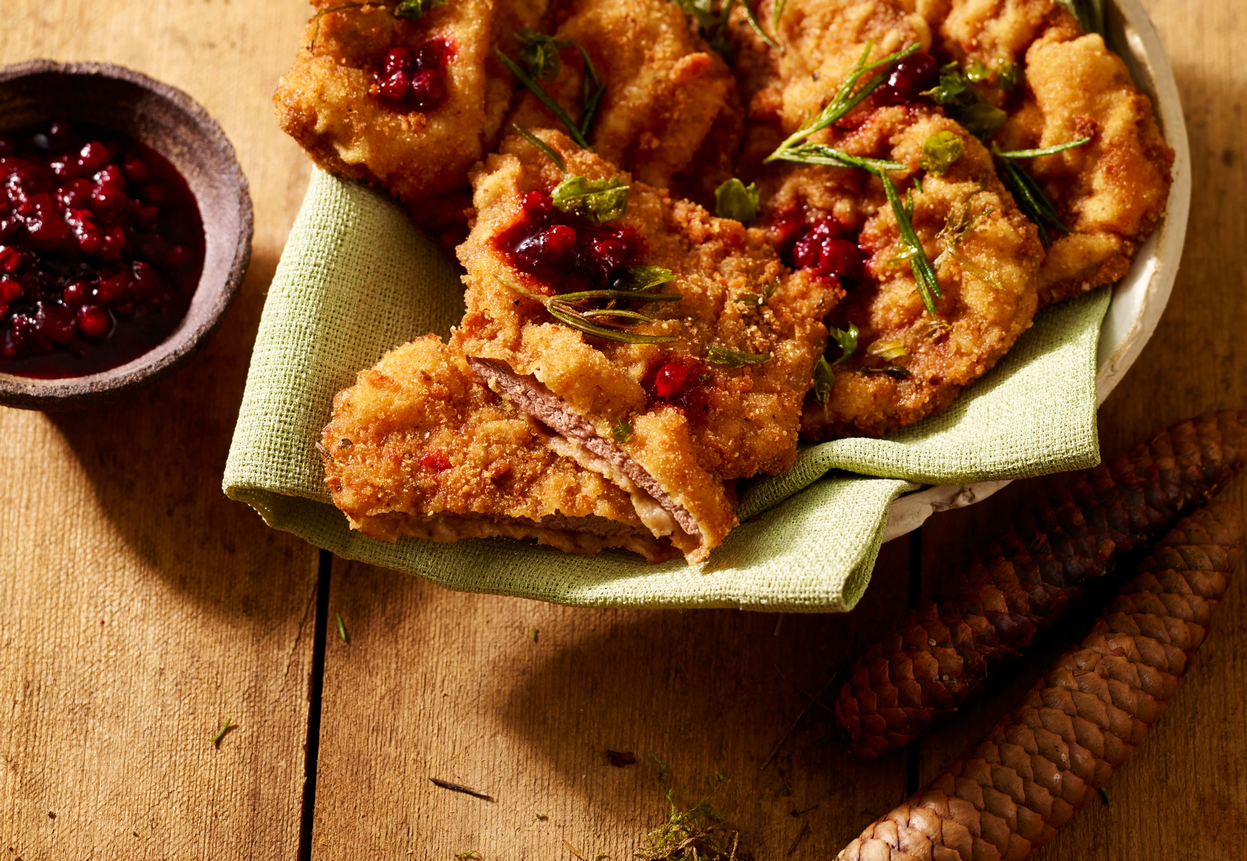 Preiselbeerkompott mit Cognac verrühren. Hirschschnitzel mit Erdäpfel-Krautsalat und Cognac-Preiselbeeren servieren.
