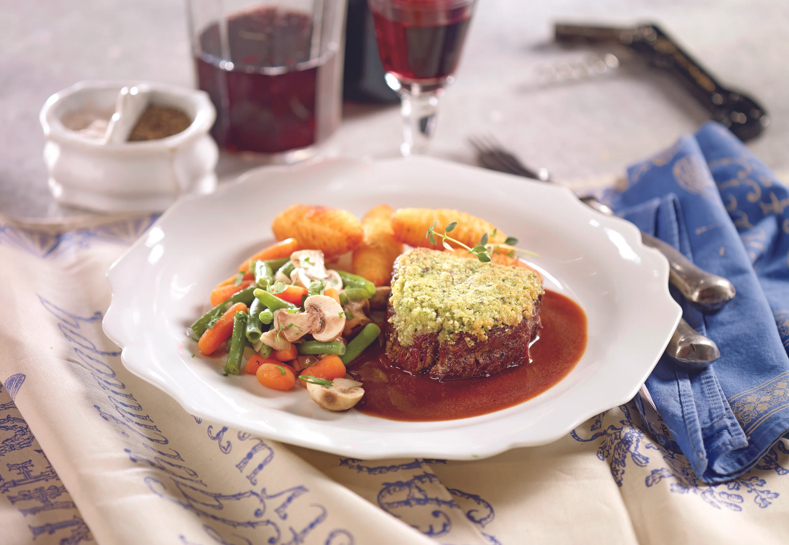 Bratrückstand mit Weinbrand und Bratensaft aufgießen und aufkochen. Sauce vom Herd nehmen und durch Einrühren der Butter verfeinern. Steaks mit Sauce und Gemüse anrichten. Dazu passen Backrohr Kroketten.
