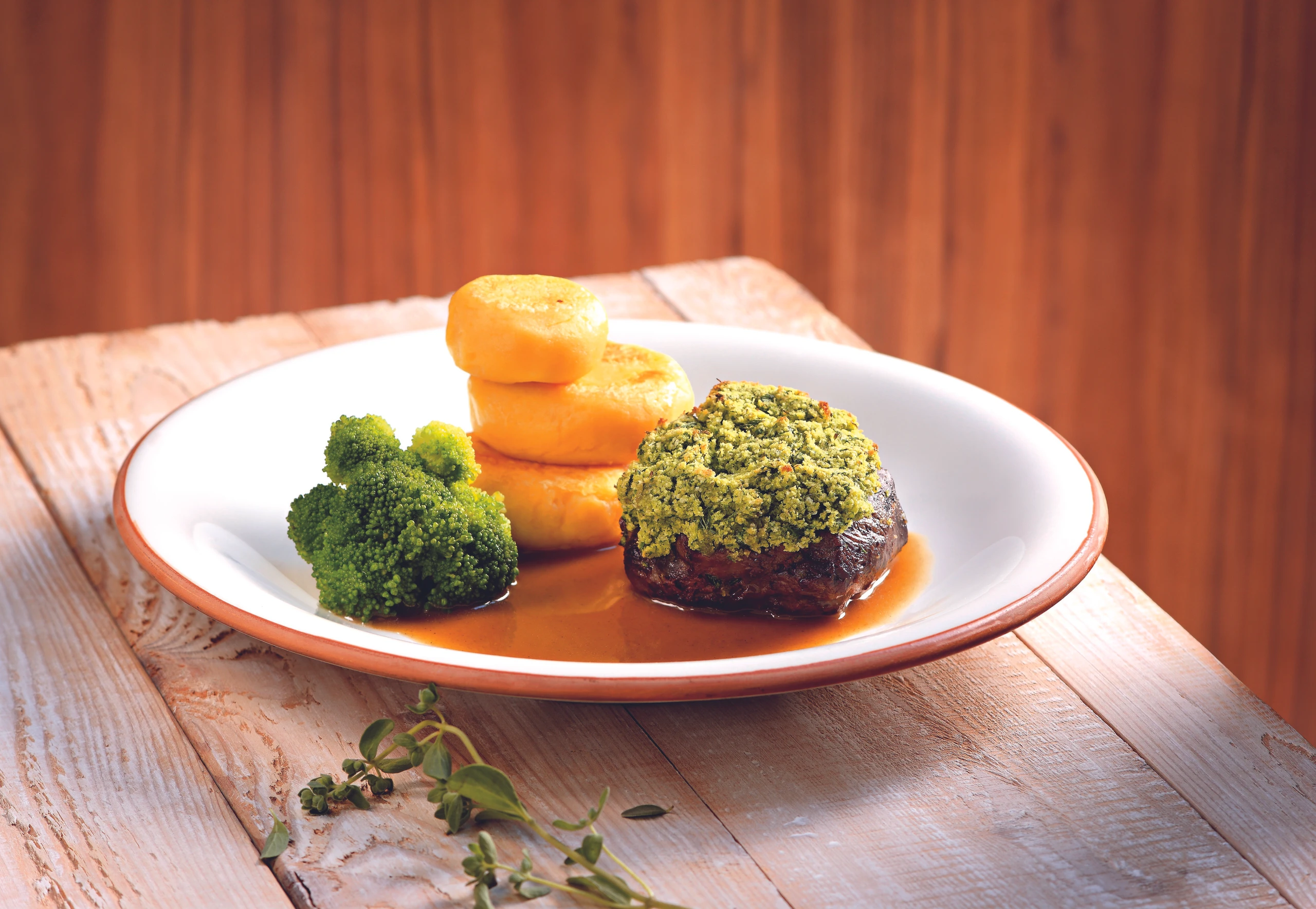 Steaks im Rohr ca. 8 Minuten überbacken. Inzwischen Sauce erhitzen und durch Einrühren der kalten Butterstücke binden. Steaks mit Sauce, Brokkoli und Erdäpfelkrapferln servieren.