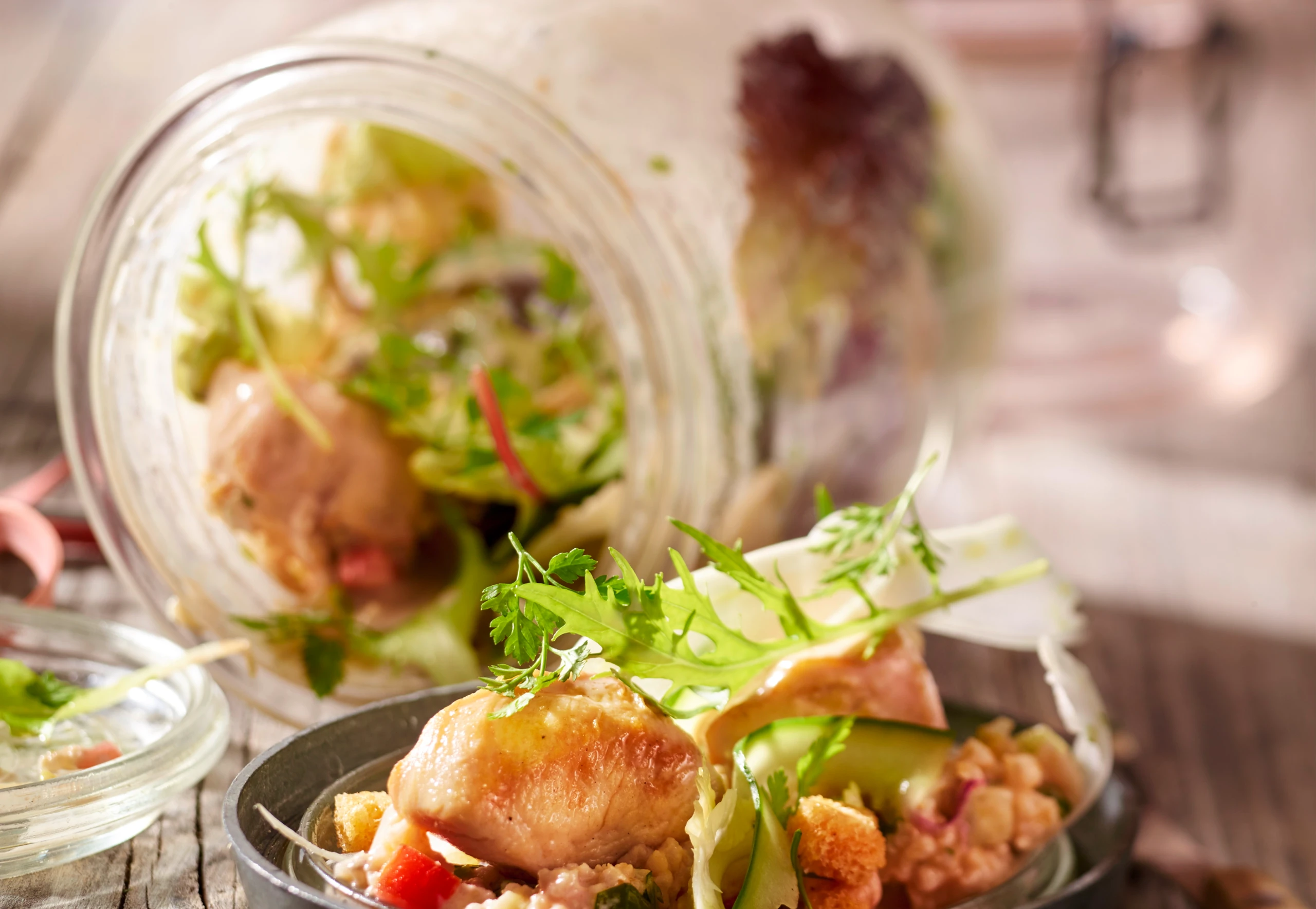 Gemüse-Hirse mit Blattsalaten und Hühnerstücken anrichten, mit Dressing beträufeln, mit Croûtons bestreuen.