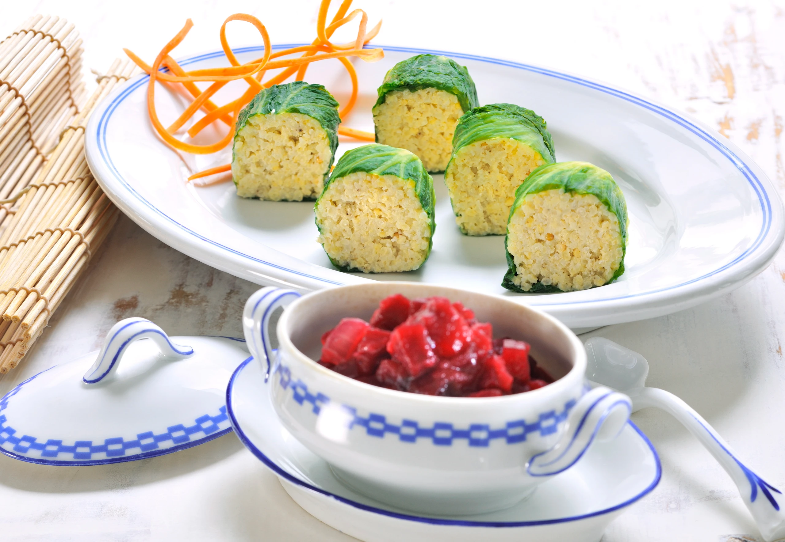 Zwei Kohlblätter auf eine Bambusmatte legen, ein Viertel der Masse als Streifen darauf verteilen, etwas andrücken, mit der Matte zu einer festen Rolle formen. Aus übrigen Kohlblättern und Hirse weitere Rollen herstellen. Maki-Rollen in je 5–6 Stücke schneiden, noch warm mit dem Rote-Rüben-Chutney servieren. Eventuell mit bissfest gekochten Karottenstreifen garnieren.
