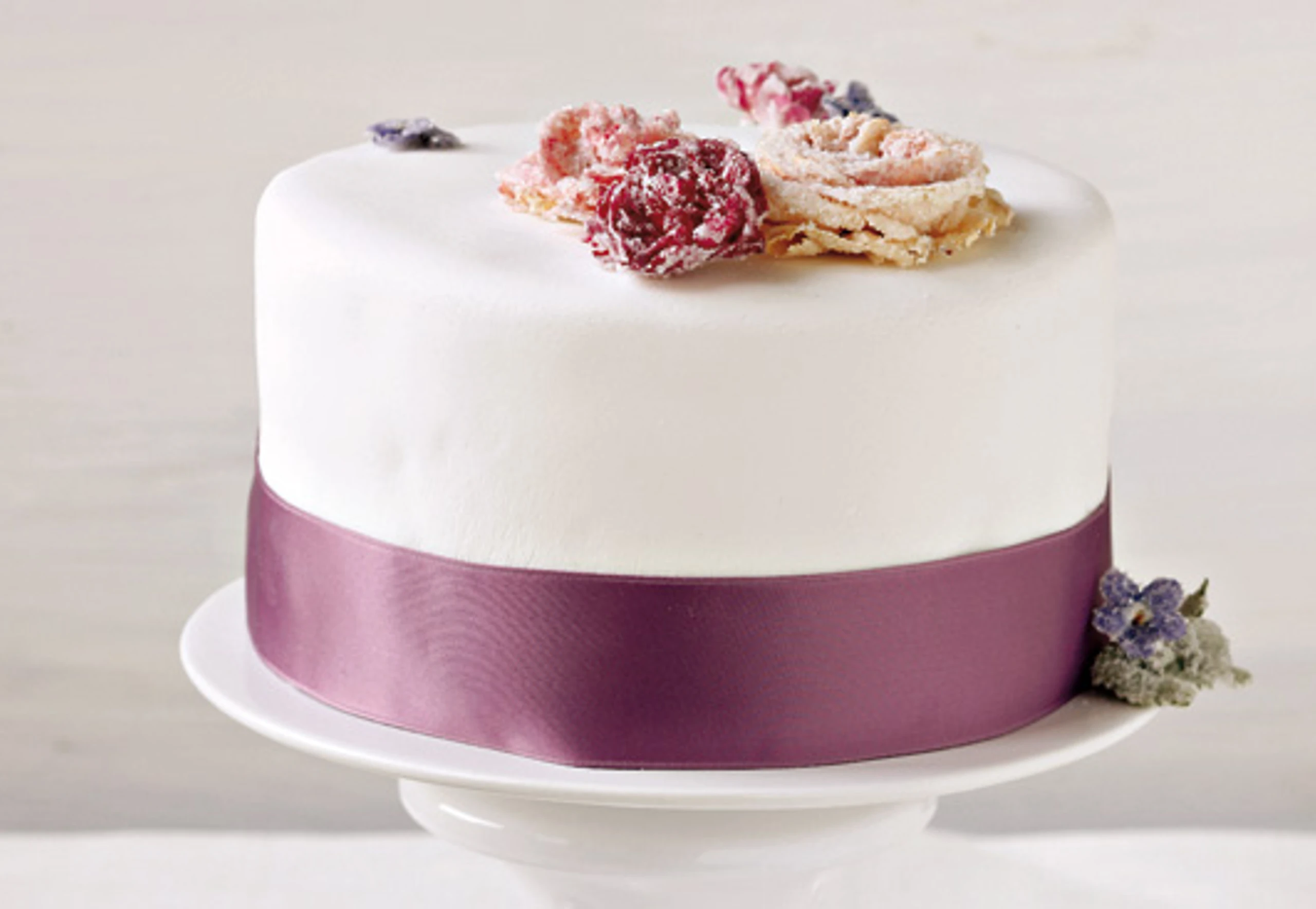 - Fondant geschmeidig kneten, auf einer mit Staubzucker bestreuten Fläche ca. 5 mm dick ausrollen. Kuchen mit Likör einpinseln, mit Fondant einkleiden. Fondant rundum andrücken, Rand wegschneiden. Torte mit Satinband und Zuckerblüten dekorieren.