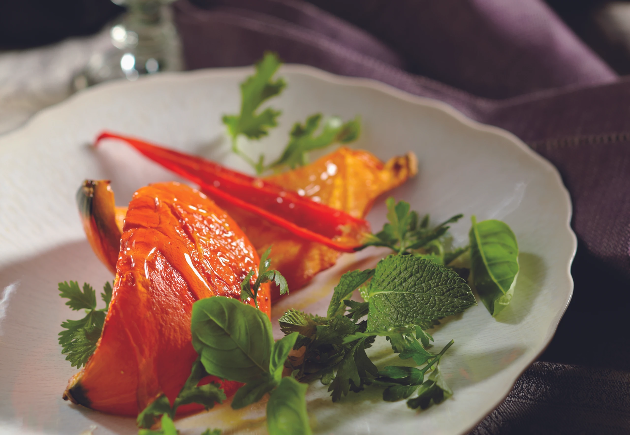Kürbisse mit Zitronensaft marinieren und zusammen mit Chilis und dem Kräutersalat anrichten.