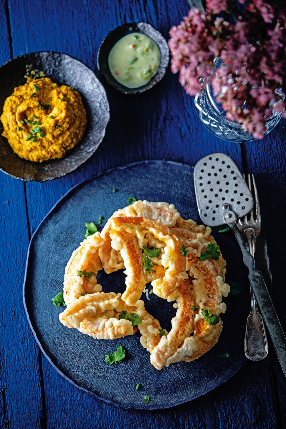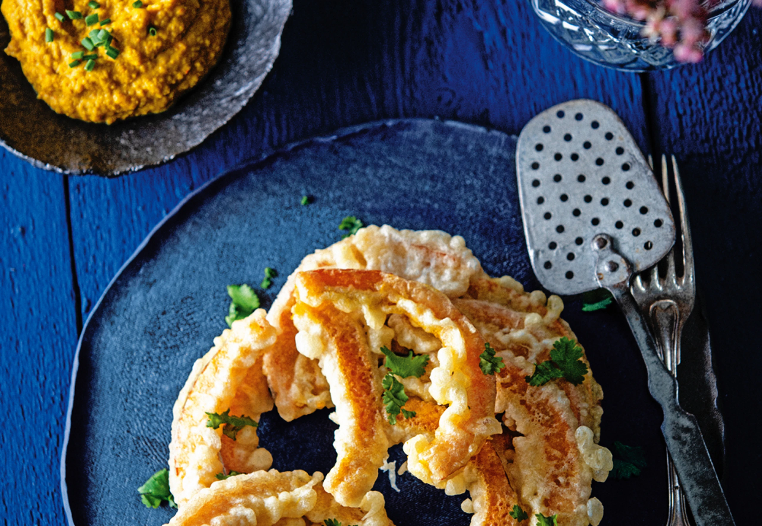 Hokkaido im Tempurateig mit Kürbishummus und Wasabisauce