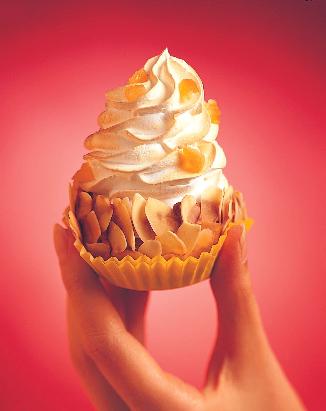 Schnee in einen Dressiersack mit Sterntülle (Nr. 8) füllen und auf die Törtchen dressieren. Schneehäubchen mit einem Brenner abflämmen oder im Rohr unter dem Grill kurz bräunen. Mit Aranzini garnieren.